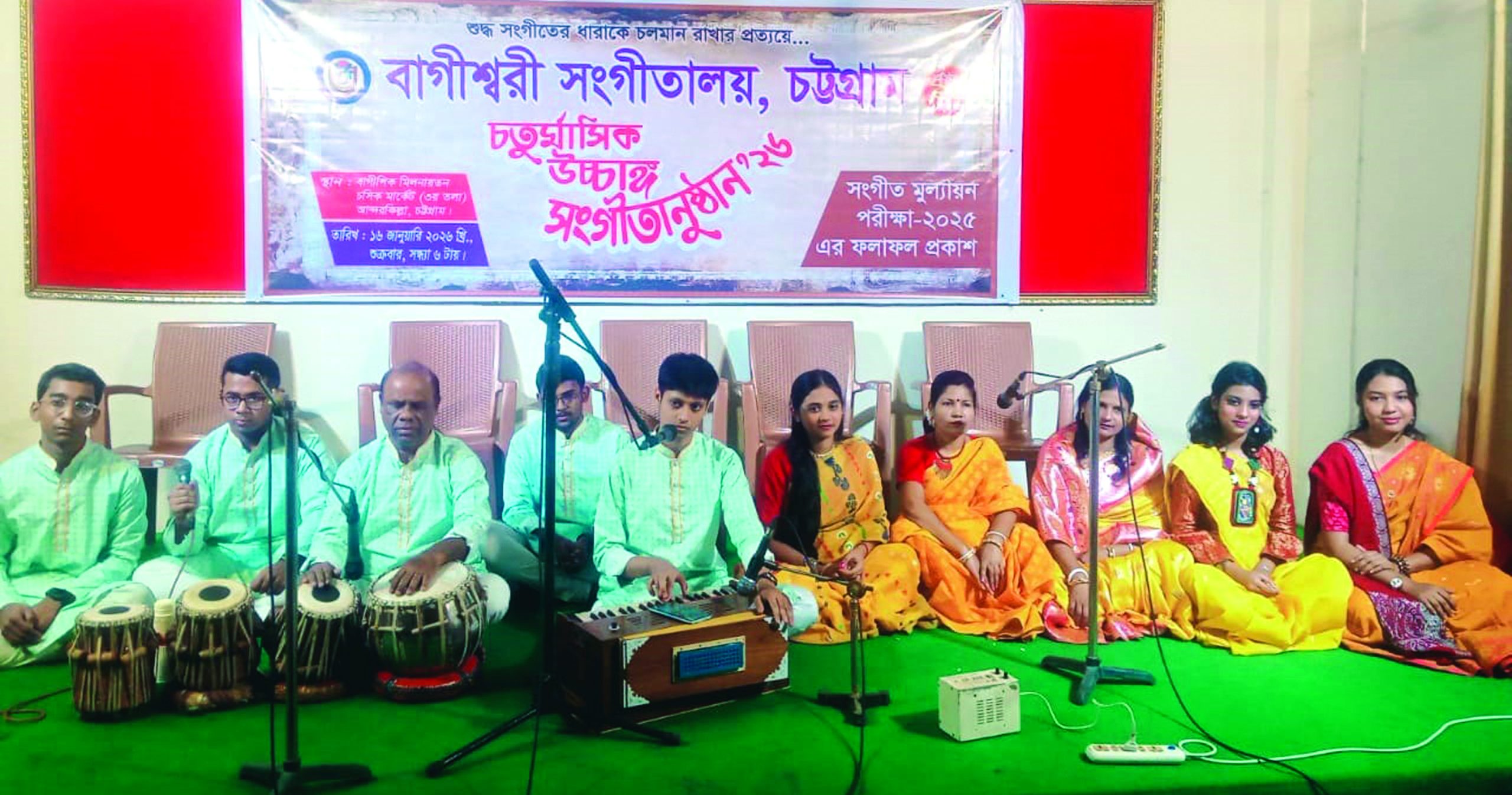 বাগীশ্বরী সংগীতালয়ের চতুর্মাসিক উচ্চাঙ্গ সংগীতানুষ্ঠান গত ১৬ জানুয়ারি আন্দরকিল্লাস্থ বাগীশিক মিলনায়তনে অনুষ্ঠিত হয়। অনুষ্ঠানে অতিথি ছিলেন সংগীত ভবনের অধ্যক্ষ কাবেরী সেনগুপ্ত, চট্টগ্রাম সরকারি মহিলা কলেজের সহকারী অধ্যাপক ছন্দা শর্মা। সভাপতিত্ব করেন সংগীতালয়ের সভাপতি কৈলাশ বিহারী সেন। স্বাগত বক্তব্য রাখেন অধ্যক্ষ রিষু তালুকদার। বক্তব্য রাখেন অনুষ্ঠান উদযাপন পরিষদের সমন্বয়ক বউৎপল চক্রবর্তী, সার্বিক তত্ত্বাবধানকারী সাংবাদিক যীশু সেন। অনুষ্ঠান সঞ্চালনায় ছিলেন শিল্পী রিমন সাহা সাহা।