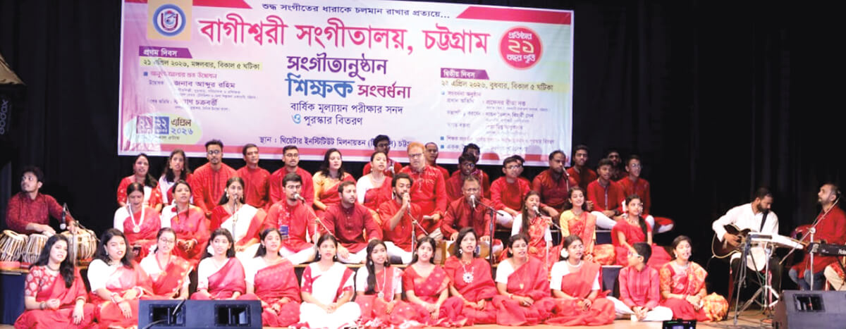বাগীশ্বরী সংগীতালয়ের ২১ বছর পূর্তি উপলক্ষে চট্টগ্রামের থিয়েটার ইনস্টিটিউট (টিআইসি) মিলনায়তনে শুরু হয়েছে দুই দিনব্যাপী বর্ণাঢ্য আয়োজন। ২১ ও ২২ এপ্রিল দুদিনের এই আয়োজনে গতকাল মঙ্গলবার প্রথম দিনে প্রাণবন্ত আলোচনা সভা ও মনোজ্ঞ সংগীতানুষ্ঠানের মাধ্যমে মুখর হয়ে ওঠে পুরো মিলনায়তন। অনুষ্ঠান উদ্বোধন করেন বাংলাদেশ বেতার ও টেলিভিশনের সুরকার ও সংগীতশিল্পী আব্দুর রহিম। অনুষ্ঠানে সভাপতিত্ব করেন বাগীশ্বরী সংগীতালয়ের সভাপতি লায়ন কৈলাশ বিহারী সেন এবং স্বাগত বক্তব্য প্রদান করেন অধ্যক্ষ রিষু তালুকদার। আবৃত্তিশিল্পী অদিতি সাহার সঞ্চালনায় অনুষ্ঠানে বক্তব্য রাখেন অনুষ্ঠান উদযাপন পরিষদের আহ্বায়ক সাংবাদিক যীশু সেন, সদস্য সচিব প্রকৌশলী রিমন সাহা, ব্যাংকার উৎপল চক্রবর্তী, ডা. সৌমিত্র দাশ, শিক্ষক মো. মশিউল আনোয়ার খান, শিক্ষক সমীরণ সেন ও শিক্ষক পলাশ দে।