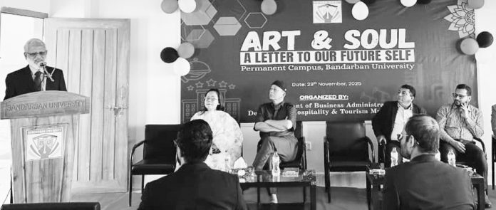 বান্দরবান বিশ্ববিদ্যালয়ের স্কুল অব বিজনেস অ্যাডমিনিস্ট্রেশনের বিবিএ ও এইচটিএম বিভাগের উদ্যোগে ‘আর্ট অ্যান্ড সোল : আ লেটার টু আওয়ার ফিউচার সেল্ফ’ শীর্ষক আলোচনা সভা, সাংস্কৃতিক পরিবেশনা ও ইনডোর গেমস গত ২৯ নভেম্বর স্থায়ী ক্যাম্পাসের একাডেমিক ভবনে অনুষ্ঠিত হয়। অনুষ্ঠানে প্রধান অতিথি ছিলেন বিশ্ববিদ্যালয়ের উপাচার্য ড. মো. মুহিবউল্ল্যাহ ছিদ্দিকী। তিনি বলেন, নিজের ভবিষ্যৎকে উদ্দেশ্য করে চিঠি লেখা শুধু একটি সৃজনশীল চর্চা নয়, বরং আত্মউন্নয়ন ও লক্ষ্য নির্ধারণের একটি কার্যকর মাধ্যম।