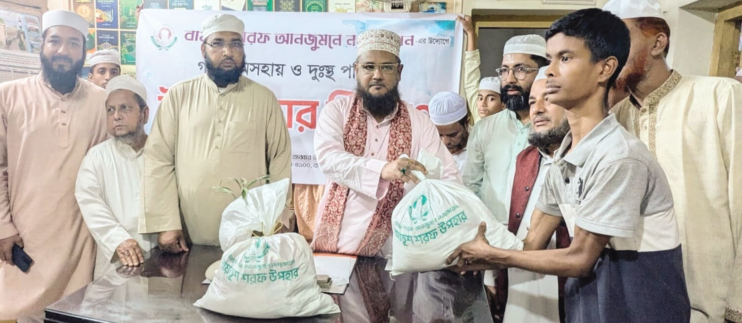 বায়তুশ শরফ দরবারের আনজুমনে নওজোয়ানের উদ্যোগে গত ১৩ মার্চ থেকে ১৫ মার্চ ৩ দিনব্যাপী পবিত্র ঈদ উপহার সামগ্রী বিতরণ করা হয়। এতে প্রধান অতিথি হিসেবে কার্যক্রম উদ্বোধন করেন রাহবারে বায়তুশ শরফ শায়খ আল্লামা মুহাম্মদ আবদুল হাই নদভী (মা.জি.আ)।এসময় উপস্থিত ছিলেন আলহাজ মোহাম্মদ হারুন শেঠ, জাহাঙ্গীর আলম শাকিল, কাজী শিহাব উদ্দিন, আবদুল কাইয়ুম, ড. ওয়ালী উল্লাহ মঈন, হাফেজ মফিজ উদ্দিন, মোহাম্মদ রিয়াজ উল্লাহ, ওসমান গণী, কবির আহমদ, এহসানুল হক মিলন, বায়তুশ শরফ আনজুমনে নওজোয়ান–এর কেন্দ্রীয় সাধারণ সম্পাদক কে.এম ইমরানুল ইসলাম, মিছবাহ উদ্দিন শাহেদ, রোকন উদ্দিন, আবদুল আজিজ, সরফুদ্দিন মুহাম্মদ জাহেদ, জুনায়েদ হোসেন, নঈম উদ্দিন, সোহাইল উদ্দিন, আবুল হাসানাত, আবদুল ওয়াহিদ আল–আমিন, সালমানুল হক আনাস। প্রধান অতিথি বলেন, আনজুমনে নওজোয়ান বিভিন্ন শাখার সদস্যদের সার্বিক সহযোগিতায় মহানগরীর ধনিয়ালাপাড়া, কদমতলী, সুপারিওয়ালা পাড়া, টি–এন্ড–টি গলি, মাদারবাড়ি এলাকায় প্রায় হাজার খানেক গরীব–অসহায় পরিবারের মাঝে ঈদ উপহারসামগ্রী ডোর টু ডোর বিতরণ করে। ভবিষ্যতেও এ কর্মসূচি চলমান থাকবে বলে তিনি আশাবাদ ব্যক্ত করেন।