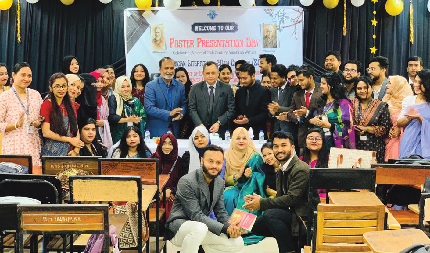 প্রিমিয়ার ইউনিভার্সিটির জিইসি মোড় ক্যাম্পাসে ইংরেজি বিভাগের উদ্যোগে অনুষ্ঠিত হয়েছে বিংশ শতাব্দীর মার্কিন সাহিত্যের ওপর এক ব্যতিক্রমী পোস্টার প্রদর্শনী। গত ১৯ বিভাগের ৪০তম ব্যাচের (৮ম সেমিস্টার) শিক্ষার্থীদের অংশগ্রহণে আয়োজিত এই প্রদর্শনীটি পুরো ক্যাম্পাসকে একটি শৈল্পিক সাহিত্য গ্যালারিতে রূপান্তর করে। ‘সেলিব্রেটিং ভয়েসেস অব টুয়েন্টিয়েথ সেঞ্চুরি আমেরিকান রাইটার্স’ শীর্ষক এই আয়োজনে শিক্ষার্থীরা তাদের পাঠ্যক্রমে অন্তর্ভুক্ত আর্নেস্ট হেমিংওয়ে, এফ স্কট ফিটজেরাল্ড এবং রবার্ট ফ্রস্টের মতো বিশ্বখ্যাত সাহিত্যিকদের জীবন ও সৃষ্টিকর্ম উপস্থাপন করে। রবার্ট ফ্রস্টের কবিতার গূঢ় দর্শন, ‘দ্য গ্রেট গেটসবাই’–এর সামাজিক ট্র্যাজেডি কিংবা ‘এ ফেয়ারওয়েল টু আর্মস’–এর যুদ্ধকালীন প্রেক্ষাপট শিক্ষার্থীরা হাতে তৈরি পোস্টারে বৈচিত্র্যময় কাঠামো ও রঙের ব্যবহারে দৃশ্যমান করে।