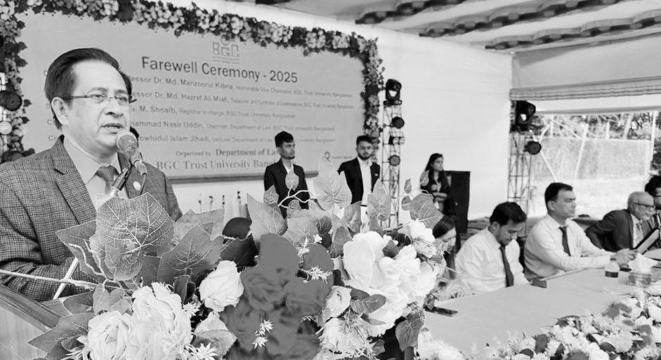 বিজিসি ট্রাস্ট ইউনিভার্সিটি বাংলাদেশের আইন বিভাগের উদ্যোগে বর্ণিল আয়োজনের মাধ্যমে বিদায় অনুষ্ঠান–২০২৫ আইন বিভাগের চেয়ারম্যান মো. নাসির উদ্দিনের সভাপতিত্বে বিশ্ববিদ্যালয়ের ফ্রিডম স্কয়ারে অনুষ্ঠিত হয়েছে। অনুষ্ঠানে প্রধান অতিথি ছিলেন বিশ্ববিদ্যালয়ের উপাচার্য (ভারপ্রাপ্ত) প্রফেসর ড. মো. মনজুরুল কিবরীয়া। বিশেষ অতিথি ছিলেন বিশ্ববিদ্যালয়ের ট্রেজারার প্রফেসর ড. হযরত আলী মিয়া ও রেজিস্ট্রার (ভারপ্রাপ্ত) ড. এস. এম. শোয়েভ।