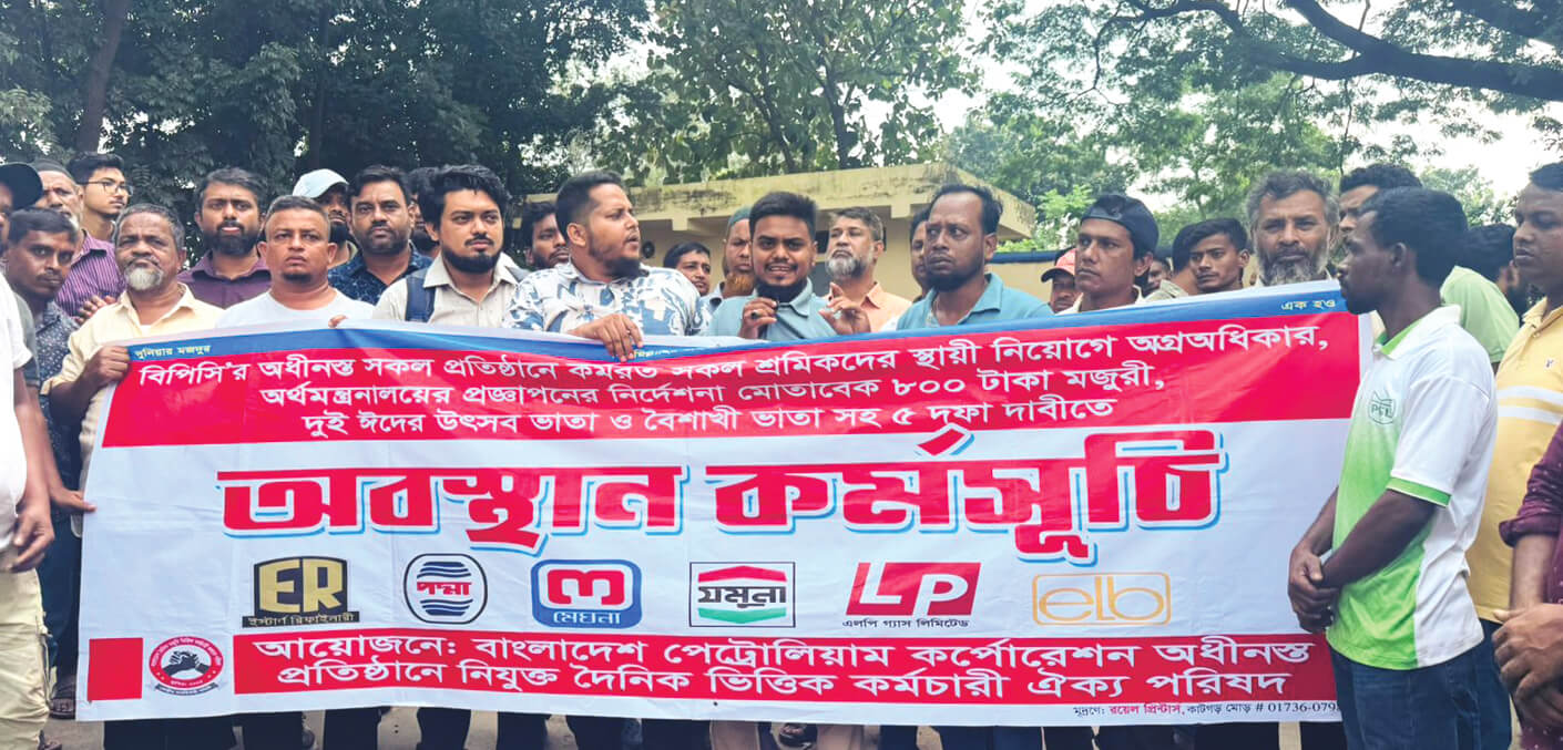 অর্থ মন্ত্রণালয়ের প্রজ্ঞাপন অনুযায়ী গত জুলাই থেকে দৈনিক ৮০০ টাকা মজুরি, ঈদ বোনাস ও বৈশাখী ভাতাসহ মোট ৫ দাবিতে ফের অবস্থান কর্মসূচি পালন করছে বিপিসির অধীনস্থ অস্থায়ী দৈনিক ভিত্তিক মজুরিতে কাজ করা শ্রমিকেরা। দাবি না মানলে এই কর্মসূচি থেকে কঠোর আন্দোলনের হুশিয়ারি দিয়েছে শ্রমিকরা। গতকাল মঙ্গলবার সকালে নগরের পতেঙ্গার পদ্মা ওয়েল কোম্পানি লিমিটেডের সামনে এই অবস্থান কর্মসূচি পালন করে শ্রমিকরা। তাদের সাথে যুক্ত হয় যমুনা ও মেঘনা অয়েলের কিছু অস্থায়ী শ্রমিক। পদ্মা ওয়েল কোম্পানি লিমিটেড (পিএলসি) শ্রমিক কর্মচারী পরিষদের সভাপতি দেলোয়ার হোসেন বলেন, সরকার আমাদের দাবি মেনে নিলেও কর্তৃপক্ষ মানছে না। আর কতদিন কম মজুরিতে কাজ করবো আমরা। দাবি মেনে না নিলে অচিরেই কঠোর আন্দোলনে নামবে শ্রমিকরা। উক্ত অবস্থান কর্মসূচিতে আরো উপস্থিত ছিলেন সংগঠনের সাধারণ সম্পাদক ফয়সাল আহমেদ। এতে আরো উপস্থিত ছিলেন কার্যকরী সভাপতি টিপু, নাজিম, মামুন, ফেডারেশনের সভাপতি মো. জামাল উদ্দিন ও সাধারণ সম্পাদক আলমগীর হোসেন জুয়েলসহ আরো অনেকে। প্রেস বিজ্ঞপ্তি।