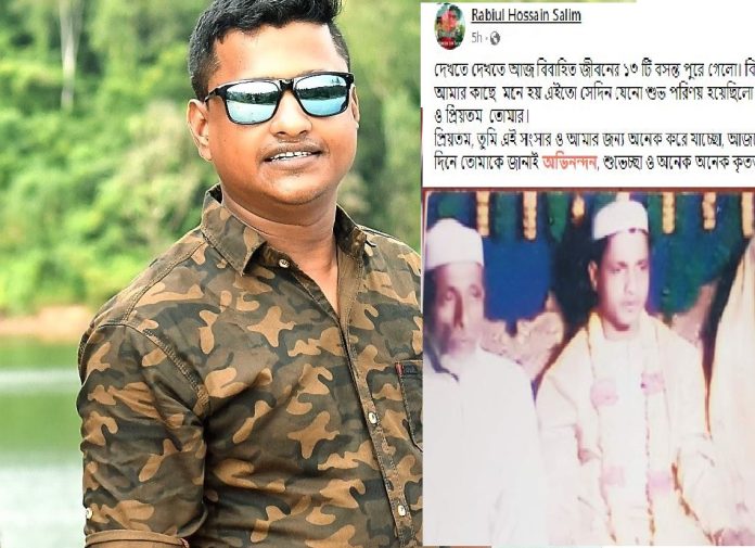 পোস্টে নিহত রবিউল হোসেন সেলিম লিখেন, ‘দেখতে দেখতে আজ বিবাহিত জীবনের ১৩ টি বসন্ত পুরে গেলো। কিন্তু আমার কাছে মনে হয় এইতো সেদিন যেনো শুভ পরিণয় হয়েছিলো আমার ও প্রিয়তম তোমার।