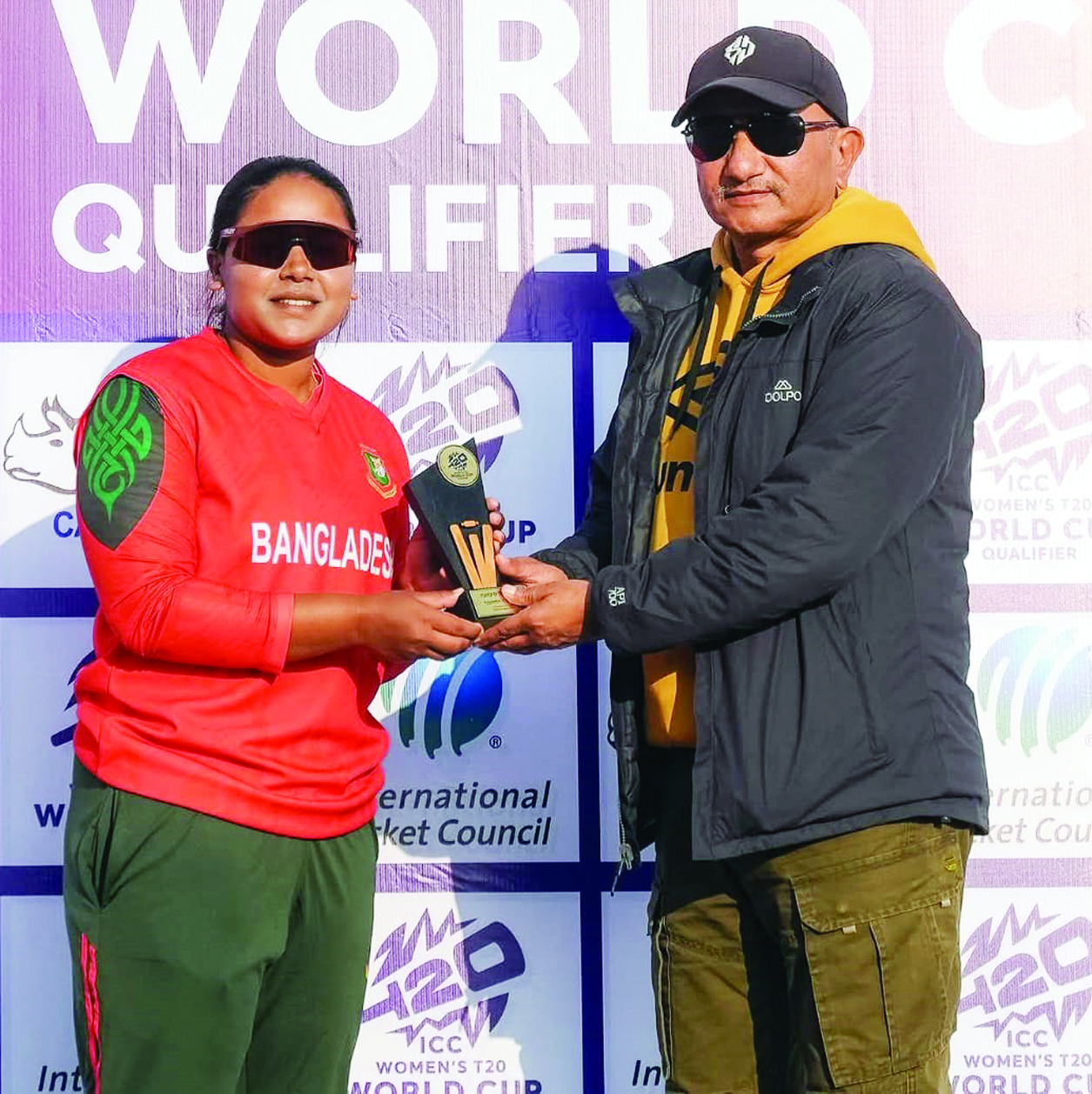 নামিবিয়ার বিপক্ষে প্রত্যাশিত জয় তুলে নিয়ে টানা তিন ম্যাচ জিতে বাংলাদেশ বিশ্বকাপ বাছাইপবের্র সুপার সিক্সে উত্তীর্ণ হয়েছে। নেপালের কীর্তিপুরে বৃহস্পতিবার উইমেন’স টি–টোয়েন্টি বিশ্বকাপের বাছাইপর্বে ৮০ রানের বড় ব্যবধানে জিতেছে বাংলাদেশ। ৭ উইকেটে ১৪৪ রানের পুঁজি গড়ে নামিবিয়াকে স্রেফ ৬৪ রানে গুটিয়ে দিয়েছে তারা। শক্তি–সামর্থ্য ও অভিজ্ঞতায় দুই দলের পার্থক্য ছিল বিশাল। মাঠের ক্রিকেটেও তা ফুটে উঠে প্রবলভাবে। ব্যাটারদের সম্মিলিত চেষ্টার পর, মেঘলা–রাবেয়াদের দুর্দান্ত বোলিংয়ে নামিবিয়া শতরানের আগেই থেমে যেতে বাধ্য হয়। যুক্তরাষ্ট্রকে হারিয়ে বাছাই পর্বের পথচলা শুরু করে বাংলাদেশ। পরের ম্যাচে তারা হারায় পাপুয়া নিউ গিনিকে। এবার টানা তৃতীয় জয়ে প্রতিযোগিতার সুপার সিক্সে খেলা নিশ্চিত করল নিগার সুলতানার দল। প্রতিপক্ষ দুর্বল হলেও, বাংলাদেশের ব্যাটিং এদিন ভালো হয়নি। দলের কেউ ছুঁতে পারেননি ৩০ রানও। ২ ছক্কা ও এক চারে ২৩ বলে সর্বোচ্চ ২৭ রান করেন সোবহানা মোস্তারি। তবে সবার চেষ্টায় দেড়শর কাছে যায় দলের পুঁজি। বোলাররা অবশ্য ছিলেন দুর্দান্ত। বাঁহাতি স্পিনে চার ওভারে স্রেফ ১৪ রান দিয়ে চার শিকার ধরেন সানজিদা আক্তার মেঘলা। ক্যারিয়ার সেরা বোলিংয়ে জেতেন ম্যাচ সেরার পুরস্কার। লেগ স্পিনার রাবেয়া খান তিন উইকেট নিতে চার ওভারে দেন কেবল পাঁচ রান। ১২ রান খরচায় আরেক লেগ স্পিনার ফাহিমা খাতুনের প্রাপ্তিও তিনটি উইকেট। ত্রিভুবন বিশ্ববিদ্যালয় মাঠে টস হেরে ব্যাটিংয়ে নেমে চতুর্থ বলে জুয়ায়রিয়া ফেরদৌসকে হারায় বাংলাদেশ। জুয়ায়রিয়া কোন রান করতে পারেননি। শারমিন আক্তারও পারেননি বেশিক্ষণ টিকতে। ২ চারে ১৩ রান করেন তিনি। পাওয়ার প্লের পরের ওভারেই ক্যাচ তুলে দেন আগ্রাসী শুরু করা দিলারা আক্তার। ১ ছক্কা ও ৪টি চারে ১৭ বলে ২৫ রান করেন এই ওপেনার। নিগার ও সোবহানা মোস্তারির ৪৬ রানের জুটিতে বাড়ে দলের রান। সোবহানা ফেরার এক ওভার পর ড্রেসিং রুমের পথ ধরেন নিগার সুলতানাও। তিনটি চারে ২১ রান করতে ২৯ বল খেলেন বাংলাদেশ অধিনায়ক। আগের ম্যাচে বাংলাদেশের হয়ে আন্তর্জাতিক ক্রিকেটে এক ইনিংসে সর্বোচ্চ ৪টি ছক্কা মারার রেকর্ড গড়া স্বর্ণা আক্তার এদিন পারেননি ছক্কা হাঁকাতে। দুই চারে ১৮ বলে ২৩ রান করেন তিনি। শেষ দিকে একটি করে ছক্কা–চার মারেন রাবেয়া। রিতু ৬ রানে আউট হয়ে গেলেও রাবেয়া ১১ রানে এবং ফাহিমা ১ রানে অপরাজিত থাকেন। নামিবিয়ার সাইমা ৩৪ রানে এবং সিলভিয়া ২১ রানে ২টি করে উইকেট নেন। এছাড়া উইলকা এবং ডাইগার্ট ১টি করে উইকেট পান।