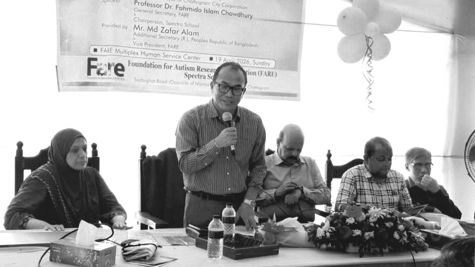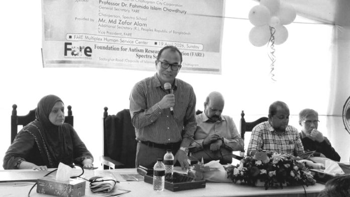 ১৯তম বিশ্ব অটিজম দিবস উপলক্ষে গতকাল ফাউন্ডেশন ফর অটিজম রিসার্চ এন্ড এডুকেশন ও স্পেক্ট্রা স্কুলের যৌথ উদ্যোগে সদরঘাটস্থ ফেয়ার মাল্টিপ্লেক্স হিউম্যান সার্ভিস সেন্টারে ফাউন্ডেশনের ভাইস প্রেসিডেন্ট জাফর আলমের সভাপতিত্বে ও ভাইস প্রেসিডেন্ট মুহাম্মদ মাহাবুবল হক খানের সঞ্চলনায় আলোচনা সভা অনুষ্ঠিত হয়। এতে প্রধান অতিথি হিসাবে বক্তব্য রাখেন সিটি কর্পোরেশনের চীফ এডুকেশন অফিসার কিসিঞ্জার চাকমা। মূল প্রবন্ধ উপস্থাপন করেন, ফাউন্ডেশনের জেনারেল সেক্রেটারি বিশিষ্ট গাইনী রোগ বিশেষজ্ঞ অধ্যাপক ( ডা.) ফাহমিদা ইসলাম চৌধুরী।