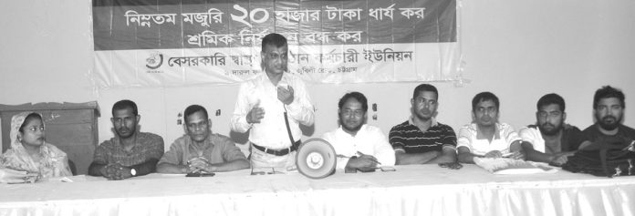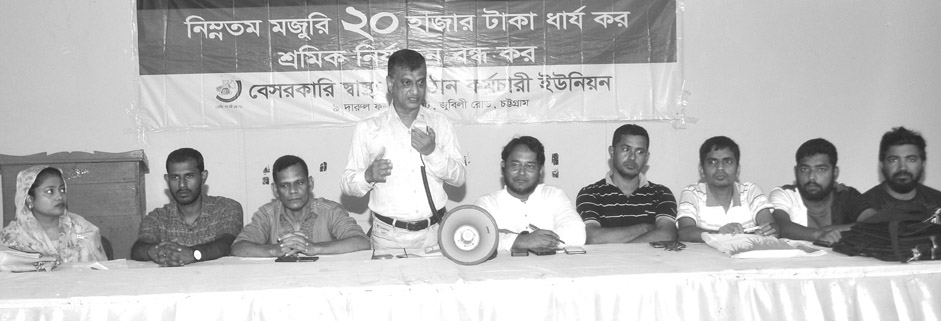 বেসরকারী স্বাস্থ্য প্রতিষ্ঠান কর্মচারী ইউনিয়নের শ্রমিক সমাবেশ প্রবর্ত্তক স্কুল এন্ড কলেজ হল রুমে ইউনিয়নের সভাপতি মোঃ আবদুর রহিমের সভাপতিত্বে ও সাধারণ সম্পাদক মোঃ মিজানুর রহমানের সঞ্চালনায় গতকাল শুক্রবার অনুষ্ঠিত হয়। সমাবেশে প্রধান অতিথি ছিলেন ইউনিয়নের উপদেষ্টা ও বাংলাদেশ ট্রেড ইউনিয়ন কেন্দ্র (টিইউসি) চট্টগ্রাম জেলার যুগ্ম সম্পাদক মোঃ ইফতেখার কামাল খান। অন্যান্যদের মধ্যে বক্তব্য রাখেন ইউনিয়নের সহসভাপতি বিপ্লব দাশ, মাহফুজুর রহমান মারুফ, বিপ্লব চক্রবর্তী, আদুরী কণা, মোঃ রিফাত, মোঃ আব্দুর নূর প্রমূখ নেতৃবৃন্দ। সভায় নেতৃবৃন্দ বলেন, /১০ বছর কাজ করলেও শ্রমিকদের মাসিক বেতন ৪/৫ হাজার টাকা। একদিন অনুপস্থিত থাকলে ২/৩ দিনের বেতন কেটে নেওয়া হয় যা শ্রম আইনের পরিপন্থী। শ্রম আইনের প্রয়োগ বা বাস্তবায়নের জন্য চট্টগ্রামে শ্রম অধিদপ্তর এবং কলকারখানা পরিদর্শন অধিদপ্তর থাকলেও তাদের কোন তৎপরতা চোখে পড়েনা। নেতৃবৃন্দ অবিলম্বে বেসরকারি স্বাস্থ্য সেক্টরে মজুরী গঠন করে নিম্নতম মজুরী ২০ হাজার টাকা নির্ধারন, শ্রমিক মেহনতি মনুষের জন্য রেশনিং প্রথা চালুর দাবী জানান। প্রেস বিজ্ঞপ্তি।