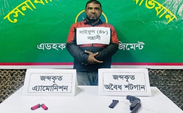 বোয়ালখালীতে অস্ত্রসহ মো. সাইফুল আলম (৫৬) নামের এক ব্যবসায়ীকে গ্রেফতার করেছে সেনাবাহিনী। এসময় তার ব্যবসায়ীক প্রতিষ্ঠান গ্যাস সিলিন্ডারের দোকানে অভিযান চালিয়ে ১টি শটগান, ২টি গুলি এবং একটি পিস্তলের ম্যাগজিন উদ্ধার করা হয়।