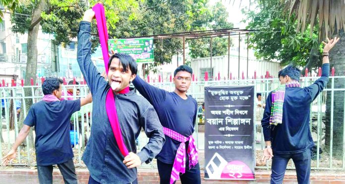 অমর একুশে উপলক্ষে বয়ান শিল্পাঙ্গন মুক্তনাটক পরিবেশন করেছে। সায়েম উদ্দীনের রচনা ও নির্দেশনায় ২১ ফেব্রুয়ারি ‘অব্যক্ত যাতনা’ পরিবেশন করেন বয়ানের নাট্যকর্মীরা। নগরীর সিনেমা প্যালেস, চেরাগী পাহাড়, রেলস্টেশন চত্বর, টেলিগ্রাফ রোড মোড়সহ পাঁচ স্থানে নাটকটির প্রদর্শনী হয়। এই নাটকে বর্তমান সময়ের নানা অসঙ্গতি তুলে ধরা হয়েছে।