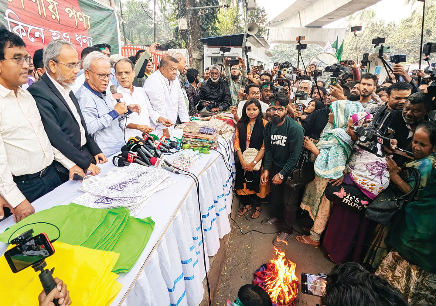 বাংলাদেশের জাতীয় পতাকা অবমাননা এবং আগরতলায় সহকারী হাই কমিশনে হামলা প্রতিবাদে ভারতীয় পণ্য বর্জনের আহ্বান জানিয়েছেন বিএনপির জ্যেষ্ঠ যুগ্ম মহাসচিব রুহুল কবির রিজভী। প্রতিবাদের অংশ হিসেবে গতকাল বৃহস্পতিবার জাতীয় প্রেস ক্লাবের সামনে এক অনুষ্ঠানে রিজভী তার স্ত্রীর দেওয়া ভারতীয় শাড়ি রাস্তায় ফেলে দিলে তাতে আগুন ধরিয়ে দেন নেতা–কর্মীরা। এ সময় রিজভী বলেন, যারা আমার দেশের পতাকাকে নামিয়ে ছিঁড়ে দেয়, আমরা তাদের দেশের পণ্য বর্জন করব। আমাদের মা–বোনেরা তারা আর ভারতীয় শাড়ি কিনবে না। তারা ভারতের সাবান কিনবে না, তারা ভারতের টুথপেস্ট কিনবে না, তারা ভারতের কোনো কিছু কিনবে না। বাংলাদেশ স্বনির্ভর উল্লেখ করে তিনি বলেন, আমরা এদের (ভারত) মুখাপেক্ষী হব না, আমরা ভারতীয় পণ্য বর্জন করব। ‘দেশীয় পণ্য কিনে হও ধন্য’ ব্যানারে ভারতীয় পণ্য বর্জন ও দেশী পণ্য ব্যবহার উৎসাহিত করতে এই অনুষ্ঠানটি হয়। খবর বিডিনিউজের।
