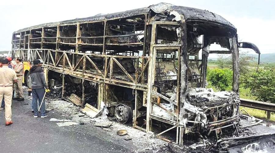 ভারতের অন্ধ্র প্রদেশের কুর্নলে বাইকের সঙ্গে সংঘর্ষের পর একটি ভলভো বাসে আগুন ধরে যাওয়ার ঘটনায় অন্তত ১৯ জন নিহত হয়েছে। গতকাল শুক্রবার স্থানীয় সময় ভোরের আগে সাড়ে তিনটার দিকে এ ঘটনা ঘটে। আগুন লাগার সময় হায়দরাবাদ থেকে বেঙ্গালুরুগামী ওই স্লিপার কোচটিতে ৪৩ জন আরোহী ছিলেন বলে কর্মকর্তাদের বরাত দিয়ে জানিয়েছে হিন্দু। খবর বিডিনিউজের।