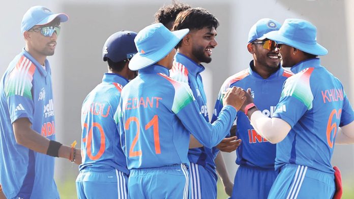 রান তাড়ায় পাকিস্তানের শুরুটা হয় দুঃস্বপ্নের মতো। ৩০ রানে ৪ উইকেট হারিয়ে ফেলে তারা। সেখান থেকে আর ঘুরে দাঁড়াতে পারেনি দলটি। নিয়মিত বিরতিতে উইকেট হারিয়ে গুটিয়ে যায় দ্রুতই। সতীর্থদের আসাযাওয়ার মাঝে লড়াই চালিয়ে যান হুজাইফা আহসান। ছয়ে নেমে ২ ছক্কা ও ৯ চারে ৭০ রান করেন তিনি। পাকিস্তানের হয়ে দুই অঙ্ক ছুঁতে পারেন আর কেবল দুই জন্য। তাদের মধ্যে ২৫ রানও করতে পারেননি কেউ। দুর্দান্ত বোলিংয়ে ১৬ রান খরচায় ৩ উইকেট নেন ভারতের ডানহাতি পেসার দিপেশ দেভেন্দ্রান। অফ স্পিনার কানিস্কও ধরেন তিন শিকার। অলরাউন্ড পারফরম্যান্সে ম্যাচ সেরার পুরস্কার জিতে নেন তিনি। দুই ম্যাচ খেলে দুটিতেই জিতল ভারত। গ্রুপ পর্বে তাদের শেষ ম্যাচ আগামী মঙ্গলবার, প্রতিপক্ষ মালয়েশিয়া। একই দিন সংযুক্ত আরব আমিরাতের বিপক্ষে গ্রুপ পর্বের শেষ ম্যাচ খেলবে মালয়েশিয়াকে হারানো পাকিস্তান। ম্যান অব দা ম্যাচ হন ভারতের কানিস্ক চৌহান।