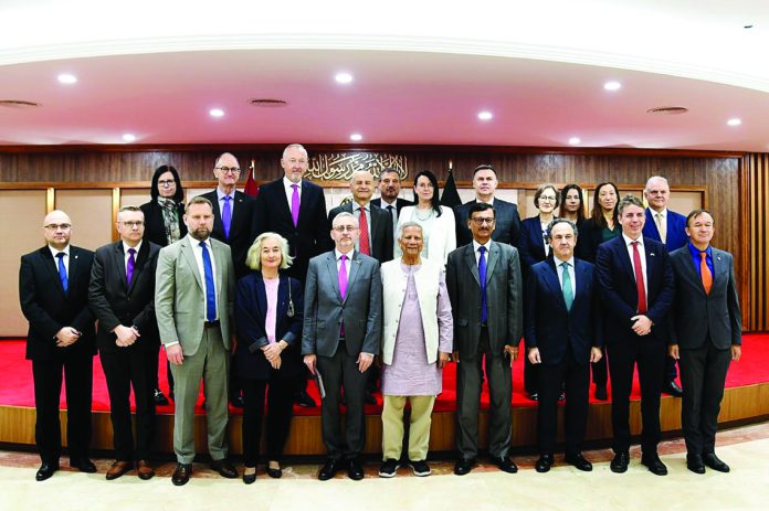 ১৯ সদস্যের প্রতিনিধিদলটির নেতৃত্বে ছিলেন বাংলাদেশে নিযুক্ত ইউরোপীয় ইউনিয়নের হেড অব ডেলিগেশন মাইকেল মিলার। প্রধান উপদেষ্টার সঙ্গে বৈঠকে অংশ নেন পররাষ্ট্র উপদেষ্টা তৌহিদ হোসেন। প্রায় আড়াই ঘণ্টাব্যাপী এ বৈঠকে ১৫ জন প্রতিনিধি তাদের মতামত তুলে ধরেন। বৈঠকে শ্রম অধিকার, বাণিজ্য সুবিধা, জলবায়ু পরিবর্তন, মানবাধিকার, ইন্টারন্যাশনাল ক্রাইম ট্রাইব্যুনাল অ্যাক্ট, রোহিঙ্গা প্রত্যাবাসন বাস্তবায়ন ও টেকসই ভবিষ্যৎ নির্মাণে উভয়ের অঙ্গীকার ও করণীয় সম্পর্কে আলোচনা হয়েছে। খবর বাংলানিউজ ও বিডিনিউজের।