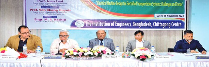 আইইবি, চট্টগ্রাম কেন্দ্রের উদ্যোগে চেয়ারম্যান প্রকৌশলী এম এ রশীদের সভাপতিত্বে গত ১৬ নভেম্বর সেমিনার অনুষ্ঠিত হয়। কেন্দ্রের সম্মানী সম্পাদক প্রকৌশলী মোহাম্মদ শাহজাহানের সঞ্চালনায় সেমিনার কক্ষে আয়োজিত এই সেমিনারে আইইবি, চট্টগ্রাম কেন্দ্রের প্রাক্তন চেয়ারম্যান ও চট্টগ্রাম ওয়াসার ব্যবস্থাপনা পরিচালক প্রকৌশলী এ কে এম ফজলুল্লাহ প্রধান অতিথি ছিলেন। সেমিনারে দুইটি মূল প্রবন্ধ উপস্থাপন করা হয়। প্রথমে নরওয়ের এগদার বিশ্ববিদ্যালয়ের ইঞ্জিনিয়ারিং সায়েন্স বিভাগের অধ্যাপক জোয়ায়ো লিয়ল ‘আন সারটেইনটি অব হান্ড্রেড ইয়ার ফ্লাড লেভেলস আন্ডার ক্লাইমেট চেঞ্জ সিনারিওস’ বিষয়ে মূল প্রবন্ধ উপস্থাপন করেন। এর পরে একই বিশ্ববিদ্যালয়ের অধ্যাপক ভন খাং হুইন ‘ইলেকট্রিক্যাল মেশিন ডিজাইন ফর ইলেকট্রিফাইড ট্রান্সপোরটেশন সিস্টেমস: চ্যালেঞ্জেস অ্যান্ড ট্রেন্ডস’ বিষয়ে তাঁর প্রবন্ধ উপস্থাপন করেন।
