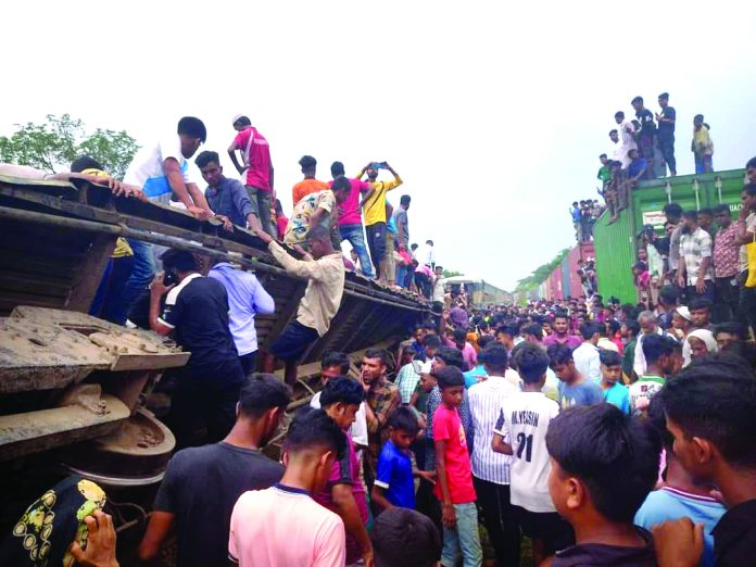 কিশোরগঞ্জের ভৈরবে একটি কন্টেনার ট্রেনের সঙ্গে সংঘর্ষের পর এগার সিন্ধুর এক্সপ্রেসের দুটি বগি উল্টে অন্তত ১৭ জনের প্রাণ গেছে। গতকাল সোমবার বিকাল পৌনে ৪টার দিকে ভৈরব রেলওয়ে স্টেশনের আউটারে এ দুর্ঘটনা ঘটে। এদের মধ্যে রাতেই ১৬ জনের লাশ স্বজনদের কাছে হস্তান্তর করা হয়েছে।