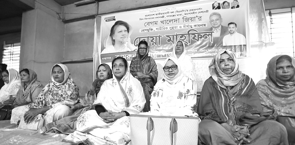 বিএনপি চেয়ারপার্সন বেগম খালেদা জিয়ার রোগমুক্তি, শারীরিক সুস্থতা ও দীর্ঘায়ু কামনায় চট্টগ্রাম মহানগর মহিলা দলের যুগ্ম সাধারণ সম্পাদিকা ও বেসরকারি কারা পরিদর্শক কামরুন নাহার লিজার ব্যবস্থাপনায় দোয়া ও মিলাদ মাহফিলের আয়োজন করা হয়েছে। গতকাল সোমবার আসরের নামাজের পর পশ্চিম মাদারবাড়ি ২৯নং ওয়ার্ডের হাবিব টাওয়ারে এই দোয়া মাহফিল অনুষ্ঠিত হয়।