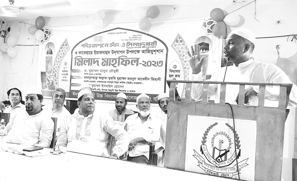 প্রধান আলোচক ছিলেন, হযরতুল আল্লামা মুফতি জয়নুল আবেদীন জিহাদী, স্বাগত বক্তব্য রাখেন, প্রতিষ্ঠানের অধ্যক্ষ মতিউর রহমান, বিশেষ অতিথি ছিলেন, নুরুল ইসলাম, মুহাম্মদ ওসমান গণি, মোহাম্মদ আজিজুল হক চৌধুরী, মোহাম্মদ নুরুল আমিন, মোহাম্মদ রবিউল হোসেন বাবুল, সিরাজুদৌল্লাহস, ফুরিদুল আলম প্রমুখ। সভা পরিচালনা করেন, মাওলানা মোহাম্মদ জসিম উদ্দিন। প্রধান অতিথি ড. মুহম্মদ মাসুম চৌধুরী বলেন, মহাকালের মহাবিশ্বের মহানবী হযরত মোহাম্মদ (দ.) উত্তমাদর্শ মানবজীবনে অনুসরণ করতে ব্যর্থ হলে অশান্ত বিশ্বে শান্তি আসা সম্ভব নয়। আমরা স্মরণ করি কিন্তু অনুসরণ করি না। স্মরণের মধ্যে অনুসরণ না থাকলে স্মরণসভার সব আয়োজনই ব্যর্থ হতে বাধ্য। প্রিয় নবীর (দ.) মহান শিক্ষা হলো, মহামানবতার সেবায় নিজের জীবনকে নিঃশেষে বিলিয়ে দেওয়ার মাধ্যমে আল্লাহর সন্তুষ্টি অর্জন করা। এখন মুসলমান সমাজ সে পথে ভুলে ভোগ বিলাসে মত্ত হয়ে রয়েছে। তিনি মহানবী (দ.)’র দেখানো সরল সঠিক পথে চলার আহবান জানান। প্রেস বিজ্ঞপ্তি।
