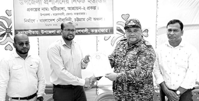 কক্সবাজারের মহেশখালী উপজেলায় গৃহহীনদের জন্য নির্মিত ১৪টি ‘ব্যারাক হাউজ’ হস্তান্তর করেছে বাংলাদেশ নৌবাহিনী। গতকাল বুধবার দুপুরে কক্সবাজার জেলা প্রশাসকের প্রতিনিধির কাছে নৌবাহিনীর পক্ষ থেকে ব্যারাক হাউজগুলো হস্তান্তর করা হয়। সংবাদ বিজ্ঞপ্তিতে জানানো হয়েছে, প্রধানমন্ত্রীর দিকনির্দেশনা এবং সশস্ত্রবাহিনী বিভাগের সার্বিক তত্ত্বাবধানে বাংলাদেশ নৌবাহিনী ব্যারাক হাউজগুলো নির্মাণ করে। প্রত্যেক ব্যারাক হাউজে ৫টি করে মোট ৭০টি ইউনিট আছে। প্রতি ইউনিটে একটি করে পরিবার থাকতে পারবে। এছাড়া প্রতিটি ব্যারাক হাউজে আলাদা আলাদা রান্নাঘর ও শৌচাগার আছে।