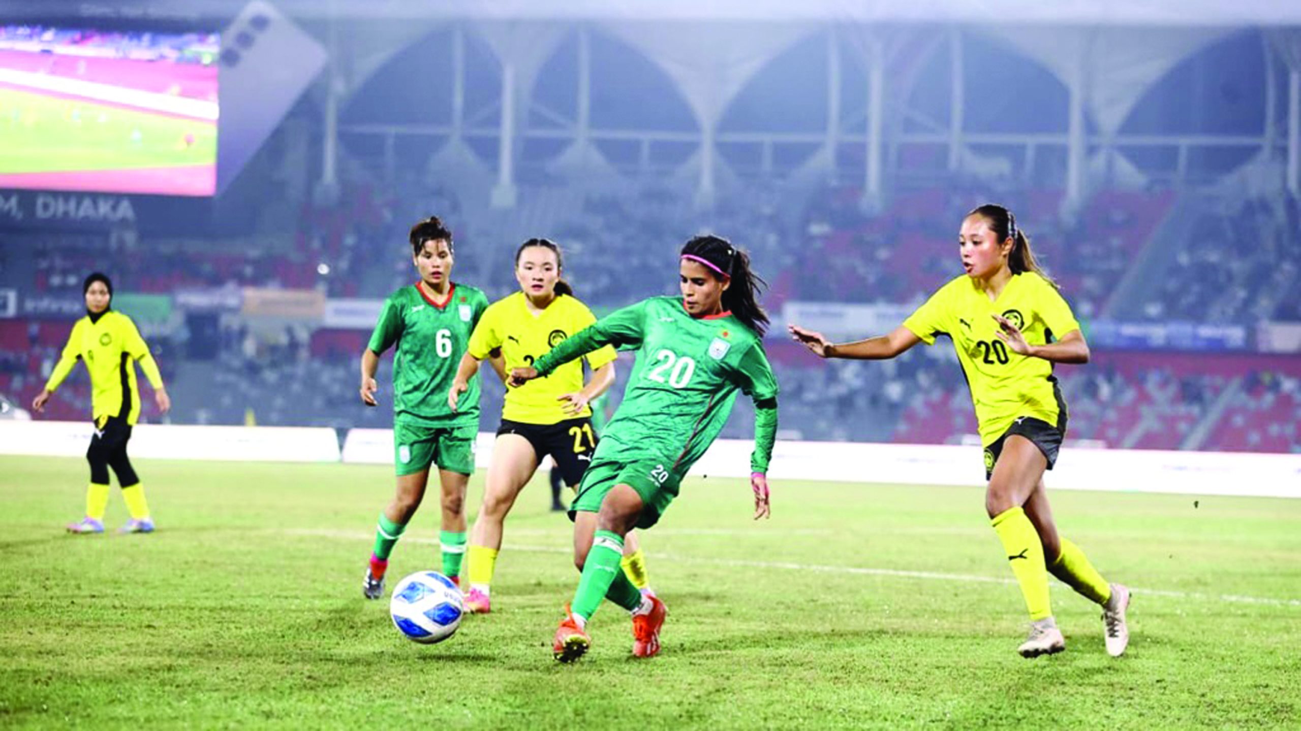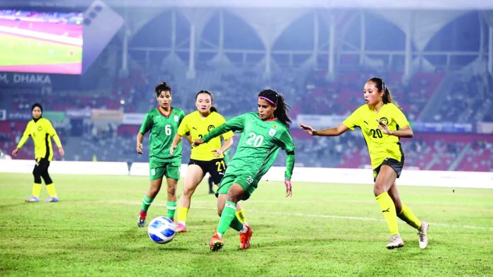 জাতীয় স্টেডিয়ামে ফেরার ক্ষণ রাঙাতে পারল না বাংলাদেশ। মালয়েশিয়ার বিপক্ষে হেরে ত্রিদেশীয় সিরিজ শুরু করল পিটার জেমস বাটলারের দল। ঢাকায় জাতীয় স্টেডিয়ামে বুধবার ত্রিদেশীয় সিরিজের প্রথম ম্যাচে ১০ ব্যবধানে হেরেছে বাংলাদেশ। ২০১৩ সালের পর এই প্রথম জাতীয় স্টেডিয়ামে প্রতিযোগিতামূলক ম্যাচ খেলল মেয়েরা। সবশেষ ফিলিপাইনের বিপক্ষে এশিয়ান কাপ বাছাইয়ের ম্যাচে এই মাঠে খেলে হেরেছিল ৪০ ব্যবধানে। ফেরার ম্যাচেও হারের তেতো স্বাদ পেল দল। ফিফা র‌্যাঙ্কিংয়ের ৯২তম অবস্থানে থাকা মালয়েশিয়ার বিপক্ষে বাংলাদেশ সবশেষ খেলেছিল তিন বছর আগে। কমলাপুরের স্টেডিয়ামের টার্ফে প্রথম ম্যাচে বাংলাদেশ ৬০ গোলে জিতলেও, গোলশূন্য ড্র করেছিল দ্বিতীয় ম্যাচে। ঘাসের মাঠে মালয়েশিয়া দেখাল তাদের সামর্থ্য। ম্যাচের শুরুতে ছন্দময় ছিল বাংলাদেশ। সপ্তম মিনিটে গোছালো আক্রমণে দারুণ সুযোগ তৈরি হয়। অভিষিক্ত সুলতানার রক্ষণচেরা পাস ধরে ডান দিক থেকে বক্সে আড়াআড়ি ক্রস বাড়ান শামসুন্নাহার জুনিয়র, ছুটে গিয়ে লাফিয়ে হেড করার চেষ্টা করেন মনিকা চাকমা; কিন্তু পাননি বলের নাগাল। ২৯তম মিনিটে পাল্টা আক্রমণে বাংলাদেশের জালে বল পাঠায় সফরকারীরা। সতীর্থের লং পাস নুর আইনসাহ বিনতে মুরাদ নিয়ন্ত্রণে নেওয়ার সময় তার পাশেই ছিলেন ডিফেন্ডার কোহাতি কিসকু। একই সময়ে রূপনা চাকমা পোস্ট ছেড়ে বেরিয়ে আসায় দুজনের মধ্যে কিছুটা ভুল বোঝাবুঝি হয়। সেই সুযোগে রূপনাকে ফাঁকি দিয়ে বাম পায়ের কোনাকুনি শটে লক্ষ্যভেদ করেন নুর। দ্বিতীয়ার্ধে মুনকি আক্তার, সুলতানা ও শামসুন্নাহার জুনিয়রের বদলি নামেন স্বপ্না রানী, তহুরা খাতুন ও সাগরিকা। তবে বাংলাদেশের খেলায় ধার ফেরেনি। এ অর্ধের শুরুতে রক্ষণে তালগোল পাকিয়ে বল হারিয়ে বিপদ ডেকে আনতে বসেছিলেন শিউলি আজিম। তবে হেনরিটা জাস্টিনের দুর্বল শট রূপনা সহজে ফেরান। ৫৭তম মিনিটে নুর নাজওয়ার শট সরাসরি যায় গোলকিপারের কাছে।