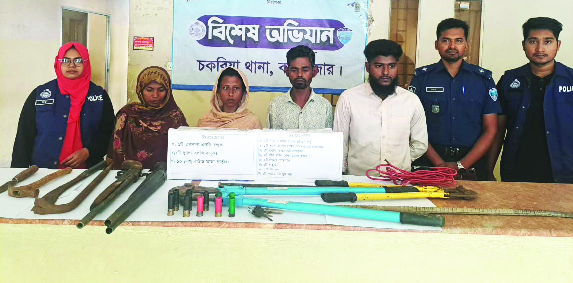 কক্সবাজারের চকরিয়ায় অভ্যন্তরীণ সড়কে ডাকাতির প্রস্তুতিকালে অভিযান চালিয়ে দুই নারীসহ চারজনকে গ্রেপ্তার করেছে পুলিশ। গ্রেপ্তারকৃতদের মধ্যে দুইজন সম্পর্কে মা ও ছেলে এবং অপর দুইজন স্বামী–স্ত্রী। অভিযানকালে তাদের কাছ থেকে দুটি আগ্নেয়াস্ত্র, ১০ রাউন্ড গুলি এবং ডাকাতির কাজে ব্যবহৃত বিপুল পরিমাণ সরঞ্জাম ও যানবাহন জব্দ করা হয়েছে।