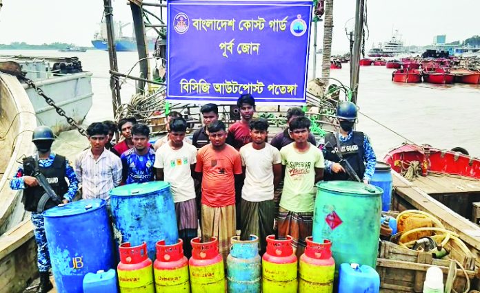 মিয়ানমারে পাচারকালে নগরীর পতেঙ্গা উপকূলে ৬ হাজার লিটার ডিজেল ও আট রোহিঙ্গাসহ ১২ জনকে আটক করেছে কোস্টগার্ড। গতকাল শনিবার চট্টগ্রাম বন্দরের বহির্নোঙরে একটি ইঞ্জিনচালিত নৌকায় অভিযান চালিয়ে এসব ডিজেল জব্দ করা হয় বলে কোস্টগার্ডের সংবাদ বিজ্ঞপ্তিতে জানানো হয়েছে।