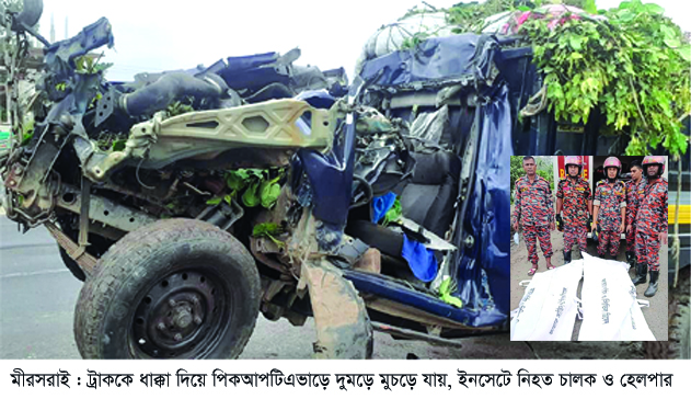 ঢাকা-চট্টগ্রাম মহাসড়কের মীরসরাইয়ের বারইয়ারহাট পৌরসভা এলাকায় সড়ক দুর্ঘটনায় পিকআপের চালক ও হেলপার নিহত হয়েছেন। জোরারগঞ্জ হাইওয়ে ইনচার্জ সোহেল সরকার জানান আজ রোববার ভোর সাড়ে ৫টার দিকে ঢাকামুখি পিকআপ চট্টমেট্রো ন- ১১-৮৫৯০, সোনাপাহাড় এলাকায় দাঁড়িয়ে থাকা ট্রাক নং ঢাকামেট্রো ১৪-৮৩২২ এর পেছনে ধাক্কা দিলে ঘটনাস্থলেই তারা নিহত হন।