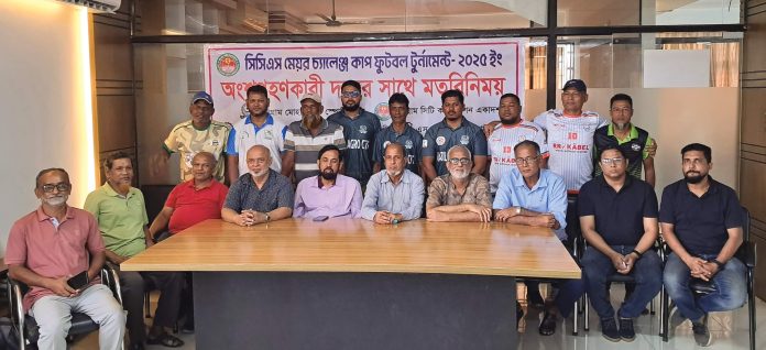 সিসিএস মেয়র চ্যালেঞ্জ কাপ ফুটবল টুর্নামেন্টে অংশগ্রহণকারী ৫ দলের সাথে মিডিয়া উপ কমিটির মতবিনিময় সভা সম্পন্ন হয়েছে। গতকাল শনিবার দুপুরে চট্টগ্রাম জেলা স্টেডিয়ামে অনুষ্টিত মতবিনিময় সভায় সভাপতিত্ব করেন মিডিয়া উপ কমিটির আহবায়ক মোহাং শাহজাহান। এতে বক্তব্য রাখেন সিজেকেএস ক্লাব সমিতির সাধারণ সম্পাদক সৈয়দ শাহাবুদ্দীন শামীম, সহ–সভাপতি মাহাবুবুর রহমান, সদস্য দেবাশীষ বড়ুয়া দেবু, এজেডএম হায়দার, মোহাম্মদ সেলিম, সাইফুল্ল্যাহ চৌধুরী, মোহাম্মদ ফারুক, তাজুল ইসলাম, সোহেল সরওয়ার সহ সংলিষ্ট কর্মকতারা। সভায় মিডিয়া কমিটির পক্ষ থেকে আসন্ন মেয়র কাপ ফুটবল টুর্নামেন্টকে সফল ও সুন্দর করতে খেলোয়াড় ও কর্মকর্তাদের মাঠে সুন্দর পরিবেশ ও শৃংখলা বজায় রাখার জন্য দলগুলোর প্রতি আহবান জানানো হয়। মতবিনিময় সভায় অংশগ্রহণকারী দলের কোচ, ম্যানেজার ও অধিনায়ক দলের প্রস্তুতি ও লক্ষের কথা তুলে ধরেন। উল্লেখ্য আগামী ২৯ অক্টোবর থেকে চট্টগ্রাম জেলা স্টেডিয়ামে শুরু হচ্ছে সিজেকেএস ক্লাব সমিতির আয়োজনে ও চট্টগ্রাম সিটি কর্পোরেশন এর মেয়র ডাঃ শাহাদাত হোসেনের পৃষ্ঠপোষকতায় ৫ দলের অংশগ্রহণে মেয়র চ্যালেঞ্জ কাপ ফুটবল টুর্নামেন্ট।