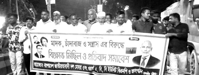 বিক্ষোভ মিছিল ও প্রতিবাদ সভামোহরা ৫নং ওয়ার্ড বিএনপি এ, বি ও সি ইউনিট ও অঙ্গসংগঠনের উদ্যোগে মাদক, চাঁদাবাজ ও সন্ত্রাসের বিরুদ্ধে বিক্ষোভ মিছিল ও প্রতিবাদ সভা গতকাল অনুষ্ঠিত হয়। সভায় সভাপতিত্ব করেন এ ইউনিট বিএনপির সভাপতি মোঃ ইকবাল। এতে উপস্থিত ছিলেন বি ইউনিট সভাপতি আনিস, সি ইউনিট সভাপতি জসিম, বি ইউনিট বিএনপির সাধারণ সম্পাদক মজিবুল হক রিপন, এ ইউনিট সাধারণ সম্পাদক আকতার, সি ইউনিট সাধারণ সম্পাদক মোঃ কামাল। এছাড়াও আওর উপস্থিত ছিলেন এ, বি ও সি ইউনিটের সকল নেতৃবৃন্দ ও ছাত্রদল, কৃষক দল, সেচ্ছাসেবক দল, শ্রমিক দলসহ সাধারণ জনসাধারণ। অনুষ্ঠান সঞ্চালনা করেন বি ইউনিট বিএনপির সাংগঠনিক সম্পাদক মোঃ মোরশেদ। এ সময় বক্তারা বলেন, চান্দগাঁও ও মোহরা এলাকায় কোনো রকম চাঁদাবাজি, মাদক ব্যবসা ও সন্ত্রাসী চলবে না এবং চলতে দেওয়া হবে না। মিছিলটি কালুরঘাট থেকে জেটি রোড হয়ে মৌলভীবাজার কামাল বাজার কাজীরহাট ও কাপ্তাই রাস্তার মাথায় গিয়ে শেষ হয়। প্রেস বিজ্ঞপ্তি।