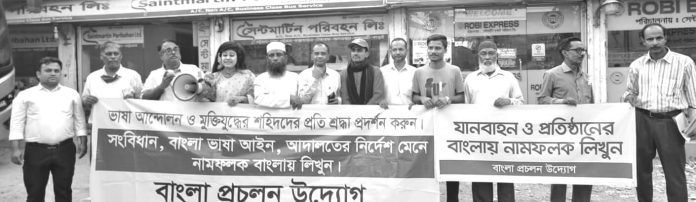 ডা. মাহফুজুর রহমানের নেতৃত্বে বাংলা প্রচলন উদ্যোগের পক্ষ থেকে যানবাহনে বাংলা প্রচলনের দাবিতে গরীব উল্লাহশাহ বাস কাউন্টারে এক পথ সভা মশিউর রহমান খানের সভাপতিত্বে অনুষ্ঠিত হয়।বাস কাউন্টার সমুহে বাংলাদেশের সংবিধান,আইন ও আদালতের নির্দেশ বাস্তবায়নের দাবিতে প্রচার পত্র বিলি করা হয়। এতে প্রতিষ্ঠানে ও যানবাহনে নামফলক বাংলায় লিখে প্রকৃত ভাষা শহীদের প্রতি সম্মান জানানোর অনুরোধ জানানো হয়। এতে বক্তব্য রাখেন সুজাউদ্দৌলা বাবুল,হাসান শহিদ রানা,আবুল বাসার হেলাল, লিটন ব্যানার্জি, চৌধুরী জসিমুল হক, দিলরুবা খানম ছুটি,জানে আলম, সিঞ্চন ভৌমিক, মোহাম্মদ হারুন, এম কাইছার উদ্দীন প্রমুখ। প্রেস বিজ্ঞপ্তি।
