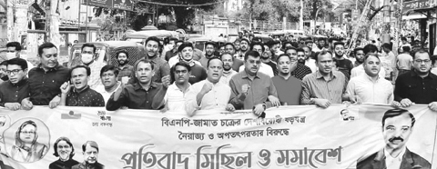 এদিকে কাউন্সিলর হাসান মুরাদ বিপ্লবের পরিচালনায় বিএনপি-জামায়াতের নৈরাজ্যের প্রতিবাদে মহানগর যুবলীগের উদ্যোগে এক বিক্ষোভ মিছিল ও সমাবেশ আব্দুল মান্নান ফেরদৌসের সভাপতিত্বে অনুষ্ঠিত হয়। এ সময় উপস্থিত ছিলেন সাখাওয়াত হোসেন সাকু, খোরশেদ আলম রহমান, নঈম উদ্দিন খান, তানভীর আহমেদ রিংকু, শহিদুর রহমান শহীদ, আ.ম.ম মহিউদ্দিন, তাজউদ্দীন রিজভী, অ্যাড. মো. কায়সার, ইসতেহার উদ্দিন পারভেজ, মো. কামরুজ্জামান কামরুল, মো. জাহাঙ্গীর আলম, আতিকুর রহমান, হেলাল উদ্দিন আহমেদ, রাজু আহমেদ, ডা. বাবর চৌধুরী, ডা. নাহিদ ইমতিয়াজ, শহিদুল ইসলাম মিন্টু, আতিকুর রহমান মাসুম, জিকু, আকবর আলী জনি, সোহেল হক, মো. আজম, মো. জাবেদ প্রমুখ। বিক্ষোভ মিছিল নিয়ে নগরীর প্রধান প্রধান সড়ক প্রদক্ষিণ শেষে এক পথ সভায় মিলিত হয় তারা।