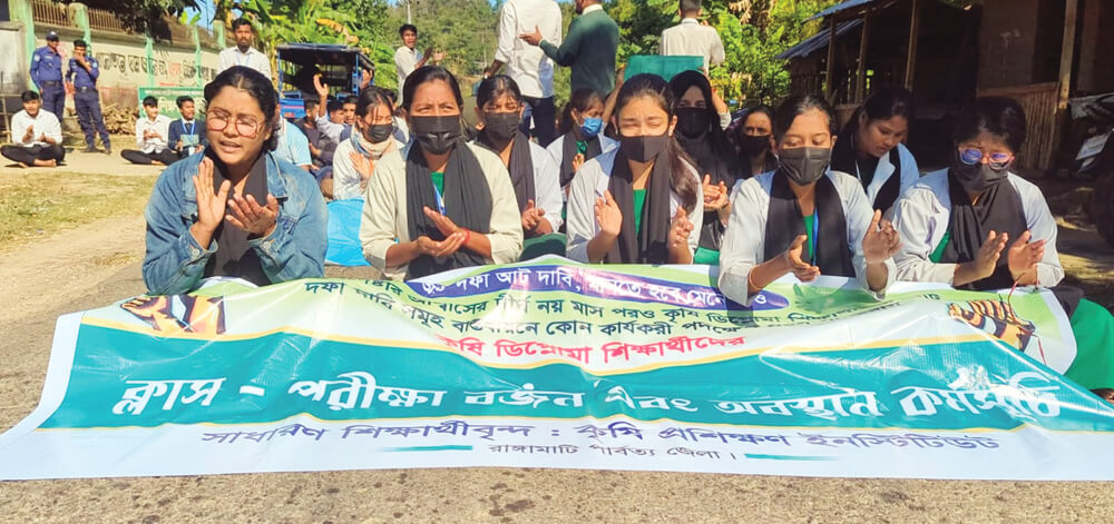 ডিপ্লোমা কৃষিবিদদের স্বতন্ত্র পাবলিক কৃষি বিশ্ববিদ্যালয়ে উচ্চশিক্ষার সুযোগসহ ৮ দফা দাবিতে রাঙামাটি কৃষি প্রশিক্ষণ ইনস্টিটিউটের শিক্ষার্থীরা রাঙামাটি–খাগড়াছড়ি আঞ্চলিক মহাসড়ক অবরোধ করে বিক্ষোভ করেছেন। গতকাল সোমবার বেলা ১১টার দিকে রাঙামাটি কৃষি প্রশিক্ষণ ইনস্টিটিউটের সামনে ঘণ্টাব্যাপী সড়ক অবরোধ করে শিক্ষার্থীরা আন্দোলন চালান। এ সময় সড়কে সব ধরনের যানচলাচল বন্ধ থাকায় সড়কের দুই পাশে প্রায় শতাধিক যানবাহন আটকে পড়ে।