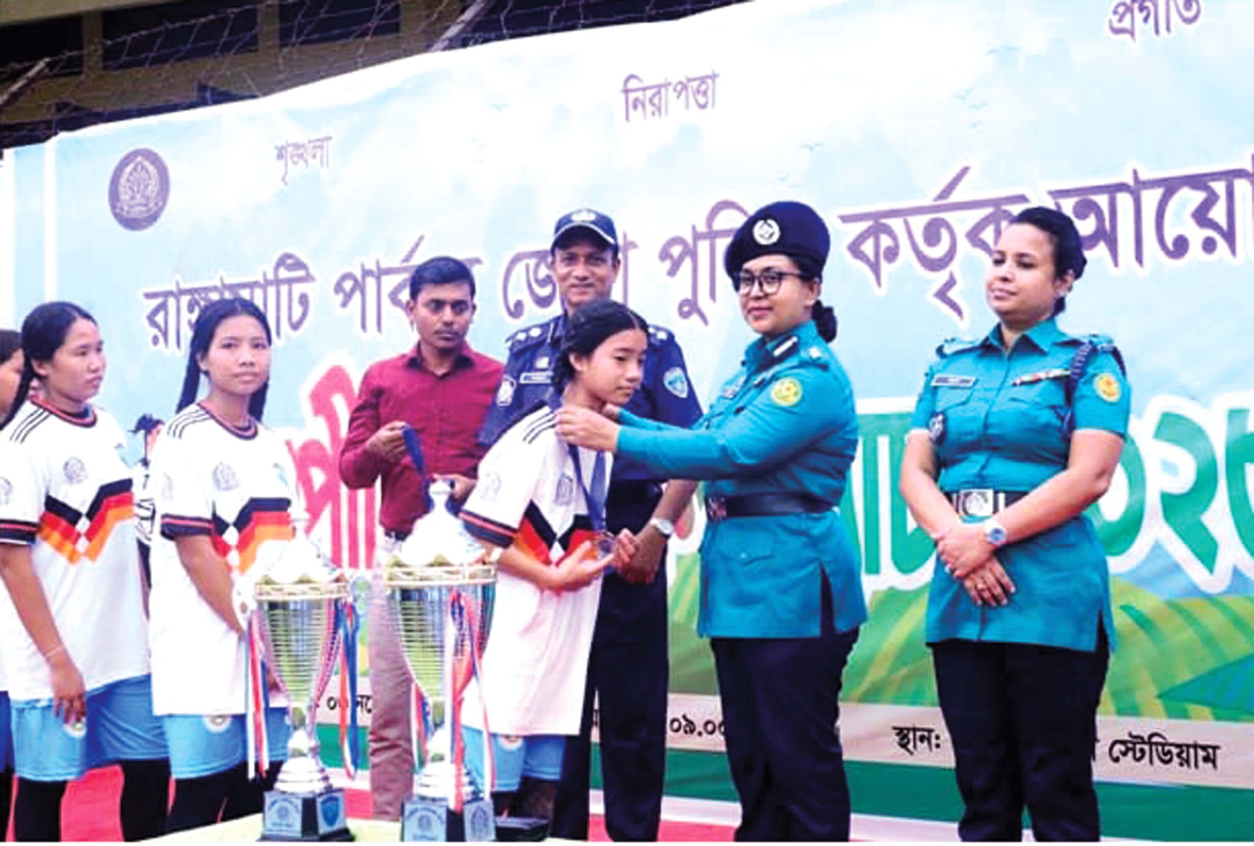 রাঙামাটি জেলা পুলিশের আয়োজনে ‘সমপ্রীতি মিনি ম্যারাথন ও সমপ্রীতি হ্যান্ডবল’ প্রতিযোগিতা অনুষ্ঠিত হয়েছে। গতকাল সোমবার সকালে পৌরসভা প্রাঙ্গণ থেকে মিনি ম্যারাথন শুরু হয়ে রাঙামাটি মারি স্টেডিয়ামে গিয়ে শেষ হয়। পরে রাঙামাটি একই ভেন্যুতে সমপ্রীতি হ্যান্ডবল ম্যাচ অনুষ্ঠিত হয়। রাঙামাটি পার্বত্য জেলা পুলিশ সুপার ড. এস এম ফরহাদ হোসেনের সভাপতিত্বে পুরস্কার বিতরণ অনুষ্ঠানে প্রধান অতিথি ছিলেন ঢাকা মেট্রোপলিটন পুলিশের যুগ্ম কমিশনার (হেডকোয়ার্টার্স) ফরিদা ইয়াসমিন। এ সময় ডিএমপির উপপুলিশ কমিশনার কাজী নুসরাত এদীব লুনাসহ অন্যান্য কর্মকর্তারা উপস্থিত ছিলেন। প্রধান অতিথির বক্তব্যে ফরিদা ইয়াসমিন বলেন, খেলাধুলা শুধু বিনোদনের মাধ্যম নয়, এটি পারস্পরিক সহমর্মিতা, সহযোগিতা ও সমপ্রীতির এক শক্তিশালী প্রতীক। এ ধরনের আয়োজনের মাধ্যমে পুলিশ বাহিনী জনগণের সঙ্গে ঘনিষ্ঠ সম্পর্ক তৈরি করছে, যা সমাজে শান্তি ও ঐক্য প্রতিষ্ঠায় গুরুত্বপূর্ণ ভূমিকা রাখবে। ভবিষ্যতেও এ ধরনের কার্যক্রম সমাজে ইতিবাচক পরিবর্তন আনতে সহায়ক হবে। সমপ্রীতি হ্যান্ডবল ম্যাচে লেকার্স পাবলিক স্কুল অ্যান্ড কলেজ এবং সমন্বিত স্কুল দল প্রতিদ্বন্দ্বীতা করে। তুমুল উত্তেজনাপূর্ণ ম্যাচটিতে লেকার্স পাবলিক স্কুল অ্যান্ড কলেজ ৮২ গোলে জয়লাভ করে।