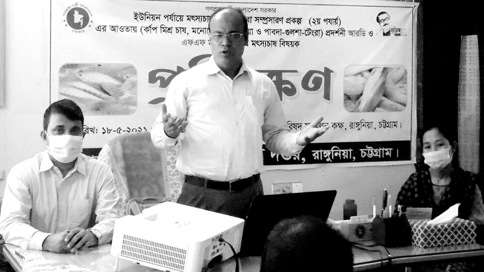 রাঙ্গুনিয়ায় ইউনিয়ন পর্যায়ে মৎস্য প্রযুক্তি সেবা সম্প্রসারণ প্রকল্পের (২য় পর্যায়) আওতায় দুই দিনব্যাপী মৎস্য চাষ বিষয়ক প্রশিক্ষণ কর্মশালা অনুষ্ঠিত হয়েছে। গতকাল বুধবার উপজেলা মৎস্য দপ্তর কার্যালয়ে সকাল থেকে দুুপুর পর্যন্ত অনুষ্ঠিত প্রশিক্ষণের প্রথম দিনে অতিথি বক্তা ছিলেন মৎস্য দপ্তরের চট্টগ্রাম বিভাগের উপপ্রকল্প পরিচালক মো. আনোয়ার হোসেন। প্রশিক্ষক ছিলেন উপজেলা মৎস্য কর্মকর্তা স্বপন চন্দ্র দে, ক্ষেত্র সহকারী ওবাইদুল হক, ক্ষেত্র সহকারী (ইউনিয়ন প্রকল্প) দিবসী চাকমা। প্রশিক্ষণে কার্প মিশ্র চাষ, তেলাপিয়া, পাবদা, গুলশা ও টেংরা মাছ চাষ বিষয়ক প্রশিক্ষণ প্রদান করা হয়। এতে ১৮ জন ফলাফল প্রদর্শক ও সহযোগী চাষী প্রশিক্ষণ নেন। পরে প্রদর্শনীর জন্য দুই মৎস্য চাষীর মাঝে মাছের খাবার বিতরণ করা হয়।