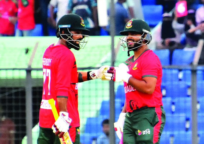 ১৮৩ রানের লক্ষ্য তাড়া করতে নেমে ৩৩ বলে ৪১ রানের সূচনা করে বাংলাদেশ। জুটিতে ২টি চার ও ১টি ছক্কায় ১৬ বলে ১৭ রান করে থামেন সাইফ। সাইফের বিদায়ে ক্রিজে এসে ২টি চার ও ১টি ছক্কায় ভালো শুরু করেন অধিনায়ক লিটন। কিন্তু নিউজিল্যান্ড স্পিনার ইশ সোধির শিকার হয়ে বড় ইনিংস খেলতে পারেননি তিনি। ২১ রানে থামেন টাইগার দলপতি। লিটন ফেরার কিছুক্ষণ পর সোধির দ্বিতীয় শিকার হন তানজিদ। ওয়ানডে মেজাজে খেলে ২৫ বলে ২০ রান করেন এই বাঁ–হাতি ব্যাটার। এতে ১১তম ওভারে ৭৭ রানে ৩ উইকেট হারায় বাংলাদেশ।