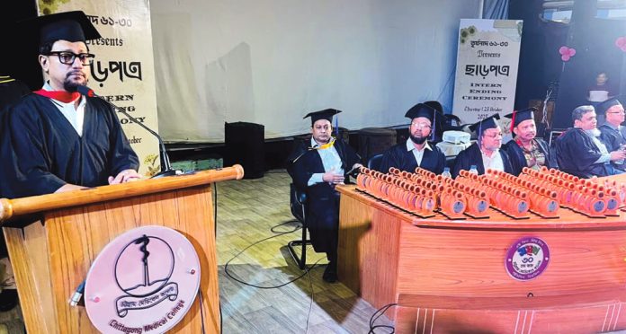 ডা. শাহাদাত হোসেন বলেন, আজকে যেসব ইন্টার্ন চিকিৎসকদের ছাড়পত্র দেয়া হল, তাদের মনে রাখতে হবে আপনাদের পূর্বসূরি চিকিৎসকরা করোনা মহামারিতে নিজের জীবনের ঝুঁকি নিয়ে কাজ করেছেন। অনেকে চিকিৎসা দিতে গিয়ে মারা গেছেন, অনেকে রোগাক্রান্ত হয়ে আজো বিভিন্ন শারীরিক জটিলতায় ভুগছেন। তাদের এই আত্মত্যাগের বিনিময়ে আমরা চিকিৎসা পেয়েছি। তরুণ চিকিৎসকদের আত্মত্যাগের এই মহিমাকে হৃদয়ে ধারণ করতে হবে। মেয়র তার কারাবাসকালীন অভিজ্ঞতা স্মরণ করে বলেন, ডাক্তার হিসেবে আমাদের মূল দায়িত্ব হলো সবসময় রোগীদের পাশে থাকা। রোগীদের সুস্থতায় আমাদের সবচেয়ে বড় আনন্দ ও তৃপ্তি। কারাগারে থাকাকালীন সময়েও আমি চিকিৎসাসেবা দিয়ে গেছি। চিকিৎসা পেশা শুধু চাকরি নয়, এটি মানবসেবার এক মহান দায়িত্ব। তিনি আরও বলেন, মানুষের আস্থার জায়গায় ডাক্তারদের পৌঁছাতে হবে। রোগীদের সঙ্গে আন্তরিক আচরণ করতে হবে। রোগীদের একটু মমতা দিয়ে কাউন্সিলিং করলে তারা যে মানসিক শক্তি পান–তা তাদের দ্রুত সুস্থ হতে সাহায্য করে। চসিক মেয়র ইতিহাসের গুরুত্বপূর্ণ অধ্যায়গুলোর উল্লেখ করে বলেন, ৫২’র ভাষা আন্দোলন, ৭১’র মুক্তিযুদ্ধ, ৯০’র স্বৈরাচারবিরোধী আন্দোলন এবং ২০২৪ সালের আন্দোলন–সবসময়ই ডাক্তাররা জনগণের পাশে ছিলেন। সকল চিকিৎসককে আহ্বান জানাই–লাল–সবুজের পতাকাকে বুকে ধারণ করে দেশ ও মানুষের সেবায় নিয়োজিত থাকতে হবে আমাদের।