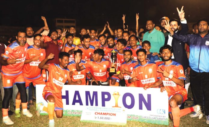 সিজেকেএস ক্লাব সমিতি আয়োজিত মেয়র চ্যালেঞ্জ কাপ ফুটবল টুর্নামেন্টের শিরোপা জিতেছে ব্রাদার্স ইউনিয়ন ক্লাব। গতকাল শনিবার চট্টগ্রাম জেলা স্টেডিয়ামে অনুষ্ঠিত ফাইনাল খেলায় রোমাঞ্চকর টাইব্রেকারে ৩২ গোলে তারা চট্টগ্রাম মোহামেডান স্পোর্টিং ক্লাবকে পরাজিত করে। খেলা নির্ধারিত সময়ে গোলশূন্যভাবে শেষ হয়। এরপর সরাসরি টাইব্রেকারে প্রথম পাঁচ শটে দু’দলের খেলা ২২ গোলে ড্র থাকে। পরে সাডেন ডেথে মোহামেডান গোল পেতে ব্যর্থ হলেও ব্রাদার্স গোল করে শিরোপা জিতে নেয়। গতকালের ফাইনাল খেলার নির্ধারিত সময়ে কোন দলই যুতসই আক্রমণ রচনা করতে পারেনি। মাঝে মাঝে হাতে গনা কিছু আক্রমণ হলেও তা থেকে দু’দলের কারোরই গোল পাওয়া হয়ে উঠেনি। খেলার ৮ মিনিটে প্রথম আক্রমন করে ব্রাদার্স। দলের দিদার রাউট উইং থেকে ফি কিকে বল বক্সে ফেলেন। সেখানে ফাঁকায় থাকা আমিরুজ্জামান সায়মনের হেড সাইডবারে লেগে প্রতিহত হয়। চার মিনিট বাদে মোহামেডানের মেজবাহউদ্দিন বক্সের বাইরে থেকে ফ্রি কিক নেন। ক্রসবার ঘেঁষে তা বাইরে চলে যায়। গোলশূন্য প্রথমার্ধের পর দ্বিতীয়ার্ধের খেলার শেষ দিকটা ছিল উত্তেজনাময়। এর আগে খেলার ৬৮ এবং ৭১ মিনিটে দুটো সুযোগ হারায় মোহামেডান। প্রথমবার নকি কয়েকজনকে কাটিয়ে নিয়ে শট করেন গোলমুখে। বল বারের উপর দিয়ে চলে যায়। পরেরবার সাকিব একাই বল নিয়ে এগিয়ে যান। কিন্তু বল প্রতিহত করেন ব্রাদার্স কিপার সাদ্দাম। একটি সুবর্ণ সুযোগ নষ্ট হয়। ৭৮ মিনিটে ব্রাদার্সও পায় দারুন সুযোগ। রাইট উইং থেকে শাহিন আলম সুন্দর ক্রস করেন বক্সে। সেখানে ছিলেন বদলি জোনায়েদ হোসেন। তিনি অনেকটা শুয়ে বলটি হেড করেন। যা চলে যায় সাইডবার ঘেঁষে। পা দিয়ে চেষ্টা করলেই হয়তো গোল পেতেন তিনি। এতে করে বড় একটি সুযোগ নষ্ট হয় ব্রাদার্সের।