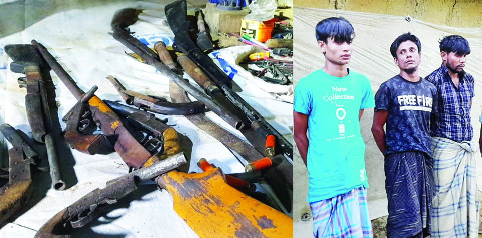 উখিয়ার কুতুপালং রোহিঙ্গা ক্যাম্পের পাহাড়ে অস্ত্র তৈরির কারখানা আবিস্কার করেছে র্যাব। সেখানে অভিযান চালিয়ে ১০টি অস্ত্র, অস্ত্র তৈরির সরঞ্জামসহ তিনজনকে আটক করা হয়েছে। গতকাল সোমবার ভোরে কুতুপালং রোহিঙ্গা শিবিরের এক্স-৪ ক্যাম্পের গহীন পাহাড়ে এ অভিযান পরিচালনা করা হয়। আটককৃতরা হলো কুতুপালং ক্যাম্প সি-১ জি ব্লকের মৃত আজিজুর রহমানের ছেলে বাইতুল্লাহ (১৯) ও হাবিব উল্লাহ (৩২) এবং জাহিদ হোসেনের ছেলে মোহাম্মদ হাছন (২৪)। এছাড়া আরো ৫-৬ জন অস্ত্র কারিগর পালিয়ে যায়। এরা সবাই মিয়ানমার ভিত্তিক উগ্র সন্ত্রাসী গ্রুপ আরসার ক্যাডার বলে রোহিঙ্গারা জানান।