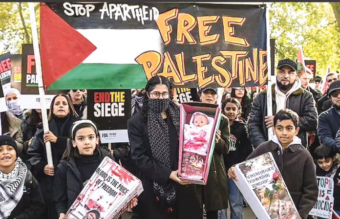 ফিলিস্তিনে ইসরায়েলি তাণ্ডব শুরুর পর থেকেই প্রতি শনিবার লন্ডনসহ ব্রিটেনের বিভিন্ন শহরে বিক্ষোভ ও র্যালি করে আসছে প্যালেস্টাইন সলিডারিটি ক্যাম্পেইন’সহ সমমনা কয়েকটি সংগঠন। এরই ধারাবাহিকতায় শনিবার (১১ নভেম্বর) রিপোর্ট লেখা পর্যন্ত সেন্ট্রাল লন্ডনে লাখো বিক্ষোভকারী জমায়েত হয়েছেন। বিক্ষোভকারীরা হোয়াইট হলের সেনোটাফ যুদ্ধের স্মৃতিসৌধ থেকে প্রায় এক মাইল দূরে হাইড পার্কে সমবেত হয়ে ভক্স হলে মার্কিন দূতাবাসের দিকে যাত্রা করেছেন। বিক্ষোভটি বিকাল ৪টায় শেষ হয়েছে। প্রথম ও দ্বিতীয় বিশ্বযুদ্ধসহ সব যুদ্ধে শহীদ সেনাদের স্মরণে ব্রিটেনে প্রতিবছর ১১ নভেম্বর পালিত হয় ‘আর্মিস্টিস ডে’ বা ‘রিমেম্বারেন্স ডে’।