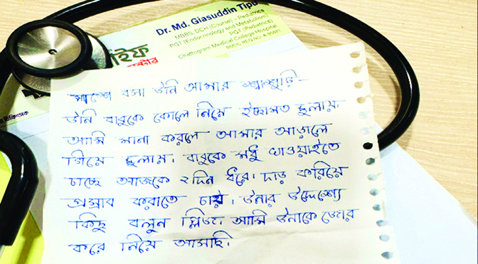 ‘পাশে বসা উনি আমার শাশুড়ি। উনি বাবুকে কোলে নিয়ে ইচ্ছামত দোলায়। আমি মানা করলে আমার আড়ালে গিয়ে দোলায়। বাবুকে মধু খাওয়াতে চাইছে ২ দিন ধরে। দাঁড় করিয়ে প্রস্রাব করাতে চায়। উনার উদ্দেশ্যে কিছু বলুন–প্লিজ’। মাত্র ২ মাস বয়সী শিশুকে নিয়ে চিকিৎসকের চেম্বারে আসা সীতাকুণ্ডের বড় কুমিরা এলাকার এক নারী লিখেছেন এই চিঠি। সঙ্গে এসেছিলেন ওই নারীর ৬০ বছর বয়সী শাশুড়ি। সীতাকুণ্ডের বার আউলিয়ায় একটি ডায়াগনস্টিক সেন্টারে শিশুরোগ বিশেষজ্ঞ ডা. মো. গিয়াসউদ্দীন টিপু তাঁর চেম্বারে মঙ্গলবার (১৭ মার্চ) এই চিঠি পান। তিনি বলেন, ‘এই মায়ের বুদ্ধি আছে বলতেই হবে। শাশুড়িকে কৌশলে আমার চেম্বারে নিয়ে এসেছেন। ফাইলের মধ্যে খুব সুন্দর করে চিঠিটা দিয়েছেন, শাশুড়ি জানেনই না! ২ মাসের একটা বাচ্চাকে কি ভয়ংকরভাবে লালন–পালনের চেষ্টা, সেটা চিঠিতেই স্পষ্ট’। খবর বাংলানিউজের।