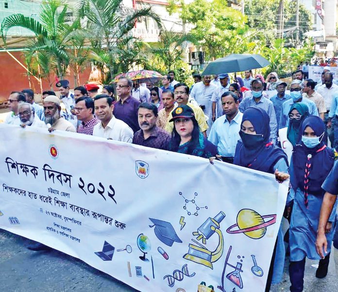 মাধ্যমিক ও উচ্চ শিক্ষা অধিদপ্তর, চট্টগ্রাম অঞ্চলের উদ্যোগে শিক্ষক দিবস উপলক্ষে বর্ণাঢ্য র‌্যালি গতকাল বৃহস্পতিবার চট্টগ্রাম কলেজ থেকে বের হয়ে চট্টগ্রাম প্রেসক্লাব প্রাঙ্গণে এসে শেষ হয়। চট্টগ্রাম কলেজের অধ্যক্ষ ও শিক্ষক দিবস উদ্‌যাপন কমিটির আহ্বায়ক অধ্যক্ষ মোহাম্মদ মোজাহেদুল ইসলাম চৌধুরীর নেতৃত্বে এতে অন্যদের মধ্যে উপস্থিত ছিলেন ওমরগণি এম ই এস কলেজের অধ্যক্ষ ও শিক্ষক দিবস উদ্‌যাপন কমিটির সদস্য আ ন ম সরওয়ার আলম, বায়তুশ শরফ কামিল মাদ্রাসার অধ্যক্ষ মাওলনা আমিনুল ইসলাম, চট্টগ্রাম পলিটেকনিক ইনস্টিটিউটের অধ্যক্ষ ইঞ্জিনিয়ার লুৎফুর নাহার, চট্টগ্রামের জেলা প্রাথমিক শিক্ষা অফিসার মুহাম্মদ শহিদুল ইসলাম, কাজেম আলী স্কুল অ্যান্ড কলেজের অধ্যক্ষ সানজিদা মোখতার তানজিন, ডা. খাস্তগীর সরকারি বালিকা উচ্চ বিদ্যালয়ের প্রধান শিক্ষকা শাহেদা আকতার, জেলা প্রাথমিক শিক্ষা অফিসার চট্টগ্রাম ও শিক্ষক দিবস উদ্‌যাপন কমিটির সদস্য সচিব মুহাম্মদ ফরিদুল আলম হোসাইনী। সার্বিক তত্ত্বাবধানে ছিলেন মাউশি, চট্টগ্রাম অঞ্চল চট্টগ্রামের পরিচালক প্রফেসর হোসাইন আহমেদ আরিফ ইলাহী, উপ-পরিচালক ড. গাজী গোলাম মাওলা, উপ-পরিচালক দেবব্রত দাশ।