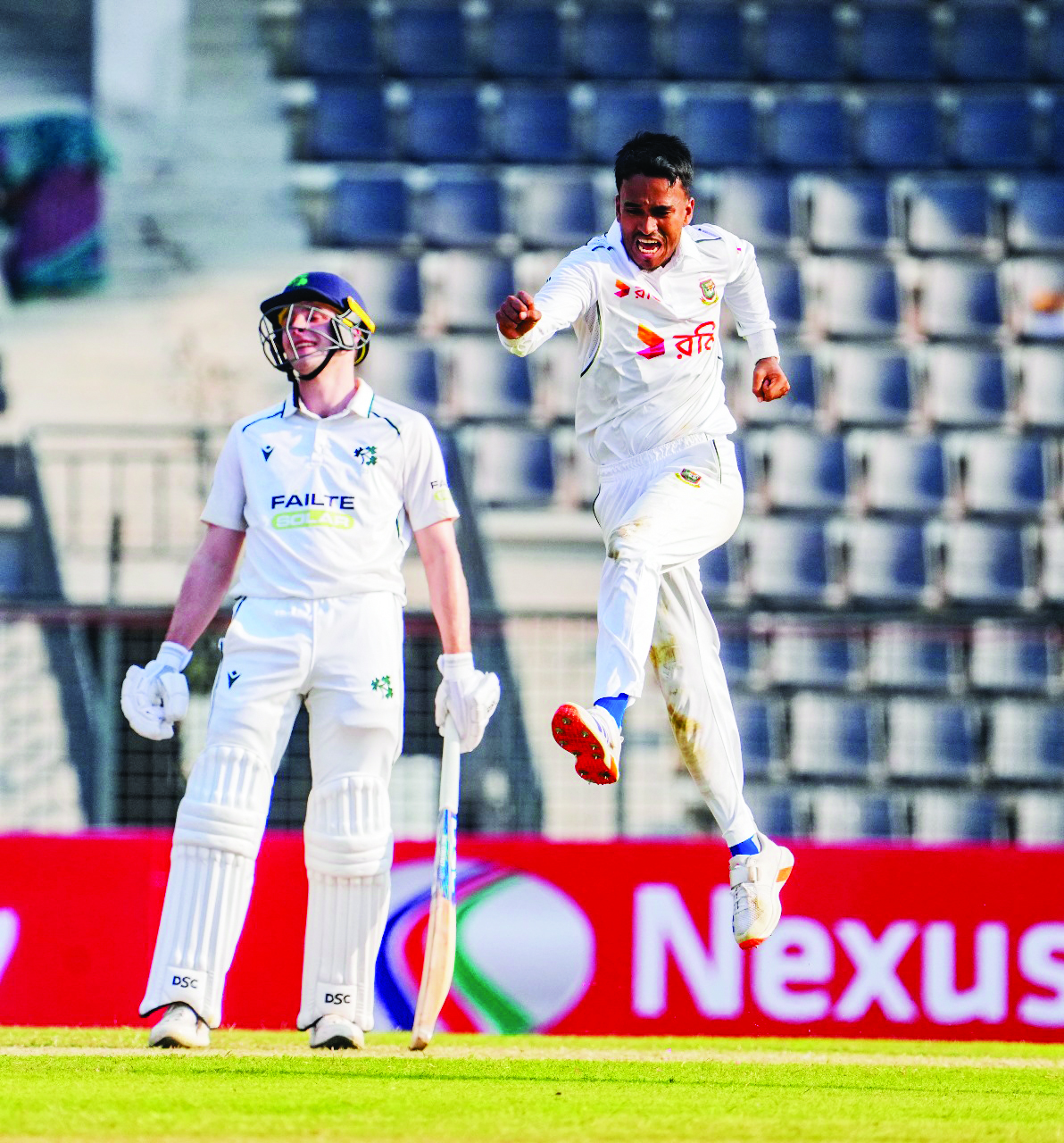 ২৩ ওভারে ৫০ রানে ৩ উইকেট নিয়ে বাংলাদেশের সফল বোলার মিরাজ। অভিষেক টেস্টের প্রথম দিন ২০ ওভার হাত ঘুড়িয়ে ৪৭ রানে ২ উইকেট নেন হাসান মুরাদ। ১টি করে উইকেট নিয়েছেন হাসান মাহমুদনাহিদ রানা ও তাইজুল ইসলাম।