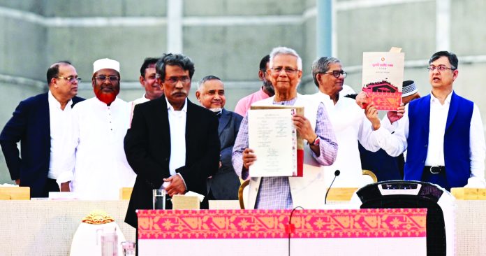 দীর্ঘ এক বছরের আলোচনার ভিত্তিতে রাষ্ট্র সংস্কারের যেসব উদ্যোগ নেওয়ার সিদ্ধান্ত হয়েছে, সেগুলো বাস্তবায়নের অঙ্গীকার সম্বলিত জুলাই সনদ স্বাক্ষরিত হলো। ঐকমত্য কমিশনের সংলাপে অংশ নেওয়া ২৫টি রাজনৈতিক দলের নেতাদের পাশাপাশি প্রধান উপদেষ্টা অধ্যাপক মুহাম্মদ ইউনূস এবং জাতীয় ঐকমত্য কমিশনের সদস্যরাও এই রাজনৈতিক সমঝোতার দলিলে স্বাক্ষর করেছেন। সনদে সই করার পর প্রধান উপদেষ্টা বলেছেন, রাজনৈতিক দল ও ঐকমত্য কমিশন অসম্ভবকে সম্ভব করেছে। জুলাই সনদ স্বাক্ষরের মধ্য দিয়ে নতুন বাংলাদেশের সূচনা হলো। সারা বিশ্বের কাছে এটি উদাহরণ হয়ে থাকবে। গতকাল শুক্রবার বিকাল ৫টায় জাতীয় সংসদ ভবনের দক্ষিণ প্লাজায় ‘জুলাই জাতীয় সনদ ২০২৫’ স্বাক্ষরের এই আনুষ্ঠানিতা সারা হয়। বিকাল ৪টায় এ অনুষ্ঠান শুরু করা থাকলেও বৃষ্টির কারণে তা আধা ঘণ্টার বেশি বিলম্বিত হয়। ঠিক সাড়ে ৪টায় ব্যান্ড দলের বাদ্যের তালে মঞ্চে এসে উপস্থিত হন প্রধান উপদেষ্টা মুহাম্মদ ইউনূস। তাঁকে স্বাগত জানান ঐকমত্য কমিশনের সহসভাপতি আলী রীয়াজ। অনুষ্ঠান মঞ্চে তাঁর সঙ্গী হন জুলাই সনদ প্রণয়নের সঙ্গে যুক্ত রাজনৈতিক দলগুলোর নেতারা। বিকাল ৪টা ৩৭ মিনিটে জাতীয় সংগীতে অনুষ্ঠান শুরু হয়। খবর বিডিনিউজের।