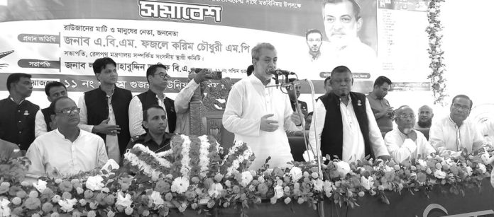 রাউজানের সংসদ সদস্য এবিএম ফজলে করিম চৌধুরী বলেছেন, ১৯৯৬ সালে প্রথম রাজনীতির মাঠে নেমে রাউজানবাসীর কাছে যেই ওয়াদা করেছিলাম সেই ওয়াদা পূরণ করেছি। মানুষের কল্যাণে কাজ করতে গিয়ে জীবনের ২৮টি বছর আমার পরিবারকে সময় দিতে পারিনি। এই সময়ে রাত জেগে কাজ করেছি বিধ্বস্ত রাউজানকে নতুন করে গড়ে তুলতে ও খুন, সন্ত্রাস, চাঁদাবাজদের তাড়িয়ে এই উপজেলাকে শান্তির জনপদ হিসাবে প্রতিষ্ঠা করতে। এই উপজেলার মানুুষের কল্যাণে সবকিছু মনের মত করে সাজিয়েছি। এসব করা সম্ভব হয়েছে আমার ত্যাগ ও শেখ হাসিনার সরকারের ধারাবাহিকতা থাকার কারণে। রাউজানের এই শান্তি, সমৃদ্ধি ধরে রাখতে আগামী নির্বাচনেও নৌকায় ভোট দিয়ে এই সরকারের ধারাবাহিকতা রক্ষা করতে হবে। তা করতে না পারলে আবারও রাউজানে খুন, সন্ত্রাসের রাজত্ব কায়েম হবে। আবারও চাঁদাবাজদের স্বর্গরাজ্যে পরিণত হবে।