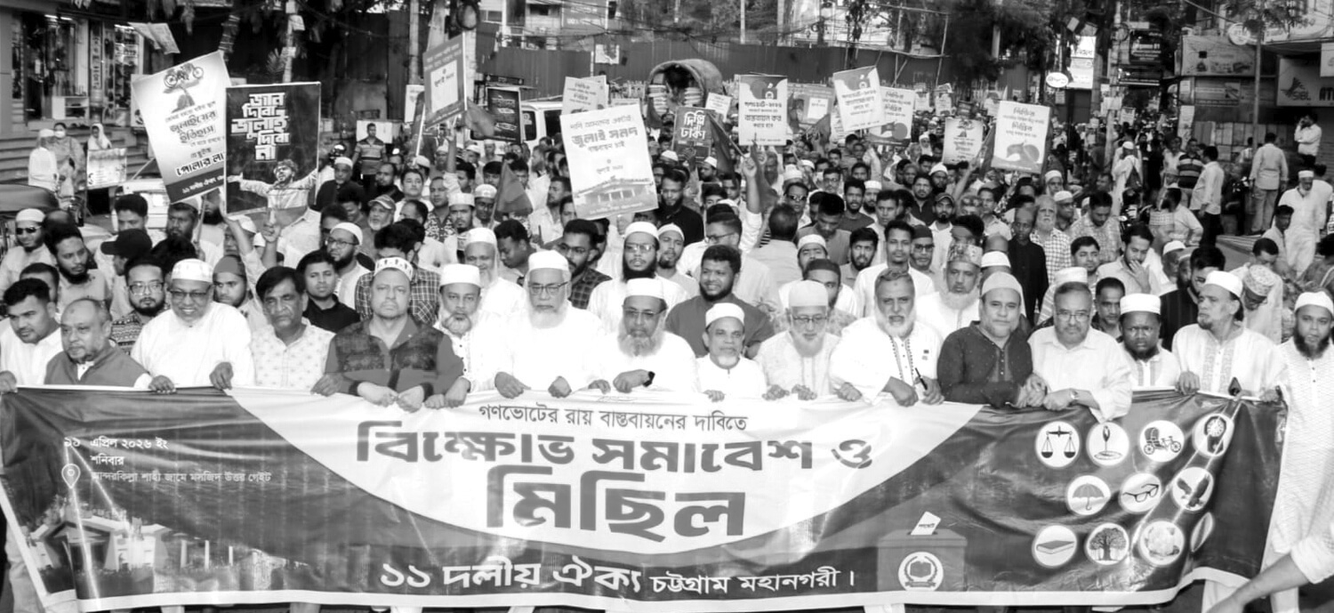গণভোটের রায় বাস্তবায়নের দাবিতে গতকাল শনিবার চট্টগ্রাম মহানগরীর ১১ দলীয় ঐক্যের উদ্যোগে আন্দরকিল্লা শাহী জামে মসজিদ উত্তর গেইটে বিক্ষোভ মিছিল ও সমাবেশে সভাপতির বক্তব্যে তিনি এসব কথা বলেন।