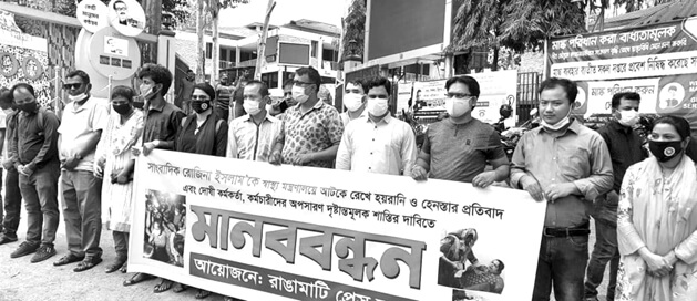 সাংবাদিক রোজিনা ইসলামের বিরুদ্ধে ষড়যন্ত্রমূলক মামলা প্রত্যাহার, নিঃশর্ত মুক্তি ও তাঁকে নির্যাতনকারীদের দৃষ্টান্তমূলক শাস্তির দাবি জানিয়ে রাঙামাটি ও চন্দনাইশে সাংবাদিকরা মানববন্ধন করেছেন। গতকাল মঙ্গলবার সকাল ১১টায় রাঙামাটি জেলা প্রশাসক কার্যালয়ের সামনে মানববন্ধনের আয়োজন করে রাঙামাটি প্রেসক্লাব। এ সময় বক্তারা বলেন, দেশে করোনাকালে রোজিনা ইসলাম একের পর এক স্বাস্থ্য বিভাগের দুর্নীতির রিপোর্ট করে গেছেন। এতে রাষ্ট্রের উপকার হয়েছে। কিন্তু দুর্নীতিবাজদের বিরুদ্ধে কোন ব্যবস্থা নেয়নি সরকার। রোজিনাকে ষড়যন্ত্রমূলক মামলা দিয়ে পুলিশের হাতে তুলে দেয়া হয়েছে। এর আগে তাঁকে ৬ ঘণ্টার অধিক সময় স্বাস্থ্য সচিবের কক্ষে আটকে রেখে নির্যাতন করা হয়েছে। দুর্নীতিবাজদের বিরুদ্ধে কোন ব্যবস্থা না নেয়ায় দেশ আজ দুর্নীতিবাজদের দখলে চলে যাচ্ছে। এতে সরকারের উন্নয়ন কর্মকাণ্ড চরমভাবে ব্যাহত হচ্ছে। বক্তারা সাংবাদিক রোজিনা ইসলামের বিরুদ্ধে করা ষড়যন্ত্রমূলক মামলা প্রত্যাহার, নিঃশর্ত মুক্তি ও তাঁকে নির্যাতনকারীদের দৃষ্টান্তমূলক শাস্তির দাবি জানান।