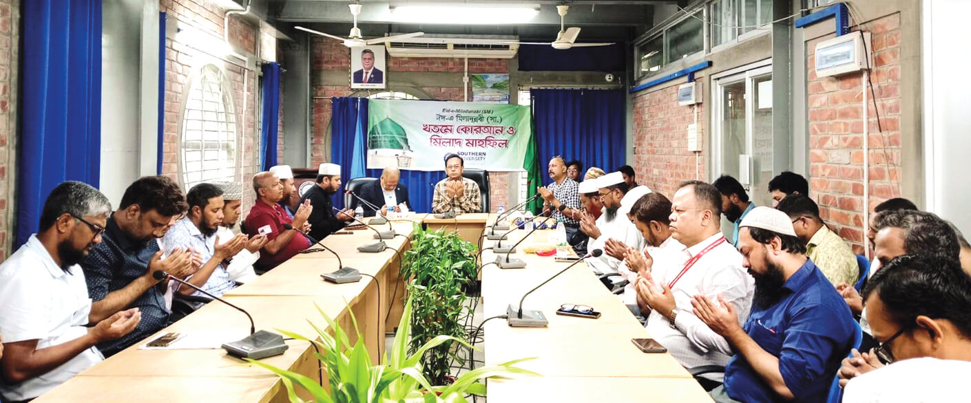 খতমে কোরআন, মিলাদ মাহফিলসহ নানা আয়োজনে সাউদার্ন ইউনিভার্সিটিতে পালিত হলো পবিত্র ঈদে মিলাদুন্নবী (দ.)। গত বৃহস্পতিবার স্থায়ী ক্যাম্পাস বায়েজিদ আরেফিন নগরের সম্মেলন কক্ষে আয়োজিত দোয়া ও মিলাদ মাহফিলে উপস্থিত ছিলেন উপাচার্য(ভারপ্রাপ্ত) ড. শরীফ আশরাফউজ্জামান, উদ্যোক্তা প্রতিষ্ঠাতা অধ্যাপক সরওয়ার জাহান, বিজ্ঞান ও প্রকৌশল অনুষদের ডিন অধ্যাপক ড. প্রকৌশলী মোজাম্মেল হক, রেজিস্ট্রার এ.এফ. এম মোদাচ্ছের আলী, হাফেজবৃন্দ, বিভিন্ন বিভাগের শিক্ষকবৃন্দসহ প্রশাসনিক কর্মকর্তারা।