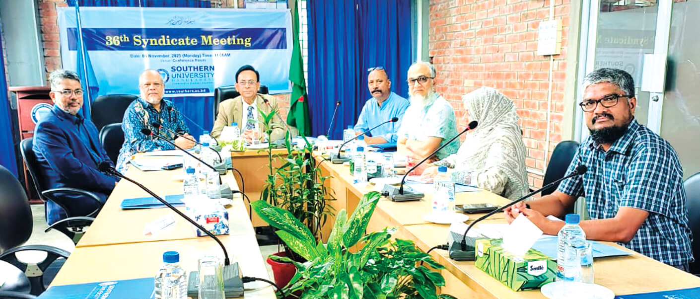 সাউদার্ন ইউনিভার্সিটির ৩৬তম সিন্ডিকেট সভা গতকাল সোমবার বিশ্ববিদ্যালয়ের স্থায়ী ক্যাম্পাস বায়েজিদ আরেফিন নগরে সম্মেলন কক্ষে অনুষ্ঠিত হয়েছে। সিন্ডিকেট সভাপতি উপাচার্য (ভারপ্রাপ্ত) ড. শরীফ আশরাফউজ্জামানের সভাপতিত্বে অনুষ্ঠিত সভায় সদস্যদের মধ্যে উপস্থিত ছিলেন ট্রাস্ট সেক্রেটারি অধ্যাপক সরওয়ার জাহান, মাধ্যমিক ও উচ্চ শিক্ষা বিভাগের অতিরিক্ত সচিব মিজানুর রহমান (অনলাইনে যুক্ত), ইউজিসির মনোনীত সদস্য ঢাকা বিশ্ববিদ্যালয়ের শিক্ষক অধ্যাপক ড. মোহাম্মদ জসীম উদ্দিন, ব্যবসায় প্রশাসন অনুষদের ডিন অধ্যাপক ড. ইসরাত জাহান, বিজ্ঞান ও প্রকৌশল অনুষদের ডিন অধ্যাপক ড. ইঞ্জিনিয়ার মোজাম্মেল হক, সাধারণ শিক্ষা বিভাগের প্রধান মোহাম্মদ জমির উদ্দিন এবং রেজিস্ট্রার এ এফ এম মোদাচ্ছের আলী।