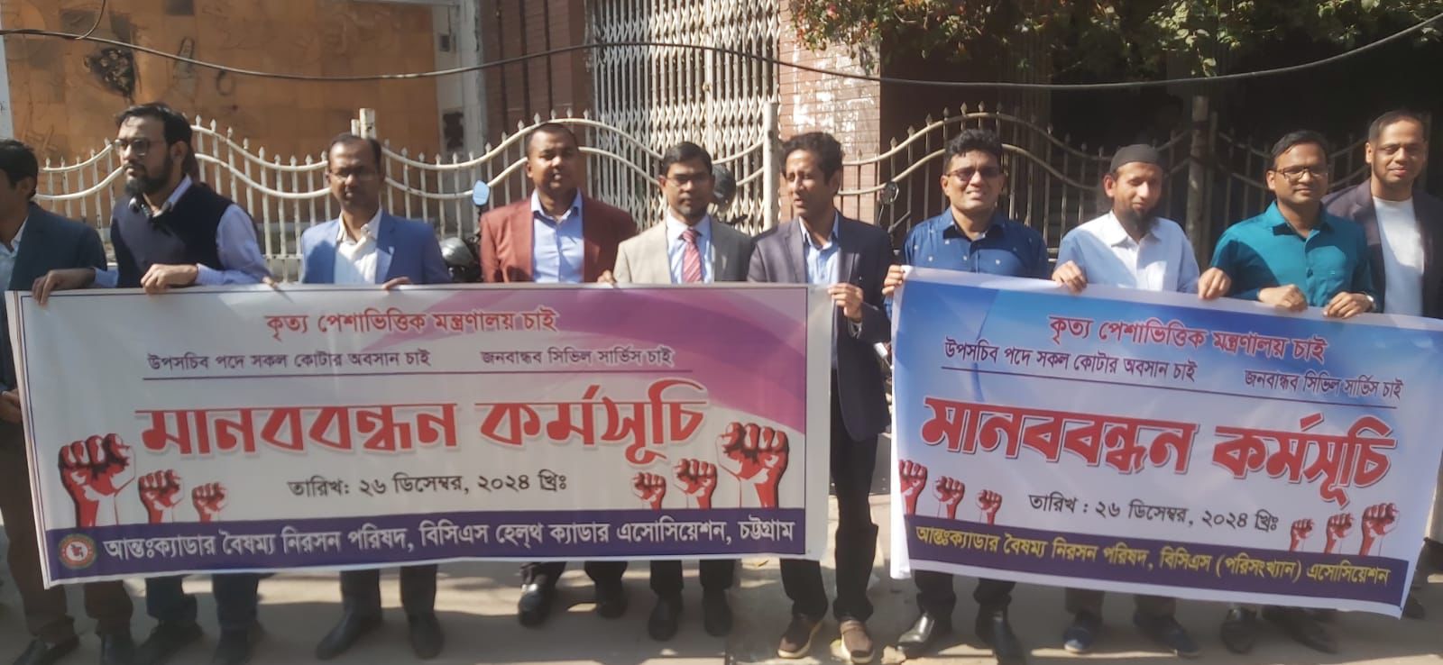 কৃত্য পেশাভিত্তিক মন্ত্রণালয় প্রতিষ্ঠা, ডিএস পুলের কোটা বাতিল, সকল ক্যাডারের সমতা বিধান এবং জনপ্রশাসন সংস্কার কমিশন প্রস্তাবিত শিক্ষা ও স্বাস্থ্য ক্যাডারকে সিভিল সার্ভিসের বহির্ভূতকরণের প্রতিবাদে গতকাল সারাদেশে মানববন্ধন কর্মসূচি পালন করেছে সিভিল সার্ভিসের ২৫টি ক্যাডারের কর্মকর্তারা।