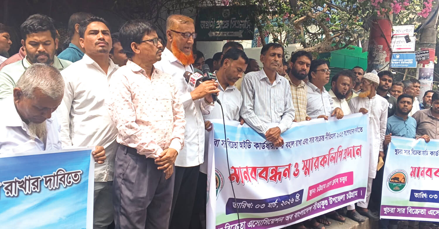 খুচরা সার বিক্রেতাদের আইডি কার্ড বহাল রাখা এবং সার সংক্রান্ত নীতিমালা ২০২৫ সংশোধনের দাবিতে চট্টগ্রামে মানববন্ধন কর্মসূচি পালিত হয়েছে। গত সোমবার চট্টগ্রাম প্রেস ক্লাব প্রাঙ্গণে খুচরা সার বিক্রেতা এসোসিয়েশন অব বাংলাদেশ চট্টগ্রাম জেলার আওতাধীন সকল উপজেলা শাখার উদ্যোগে মানববন্ধন অনুষ্ঠিত হয়। এতে জেলার বিভিন্ন উপজেলা থেকে আগত বিপুলসংখ্যক খুচরা সার বিক্রেতা অংশ নেন।