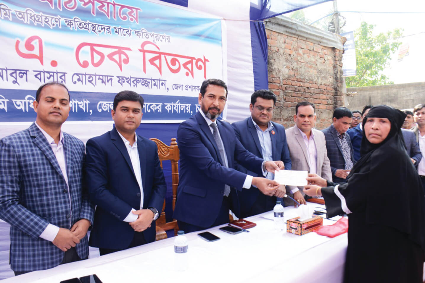 চট্টগ্রাম সিটি কর্পোরেশনের বাস্তবায়নাধীন বাড়াইপাড়া থেকে কর্ণফুলী নদী পর্যন্ত খাল খনন প্রকল্পের জন্য অধিগ্রহণকৃত ভূমির ক্ষতিগ্রস্তদের মাঝে ক্ষতিপূরণের চেক বিতরণ করেছে জেলা প্রশাসন। গতকাল রাহাত্তারপুলের বড় খবরস্থান এলাকায় জেলা প্রশাসক আবুল বাসার মোহাম্মদ ফখরুজ্জামান ৪৪ ক্ষতিগ্রস্ত ব্যক্তির মাঝে সাড়ে ৯ কোটি টাকা ক্ষতিপূরণের চেক (এলএ চেক) বিতরণ করেন।